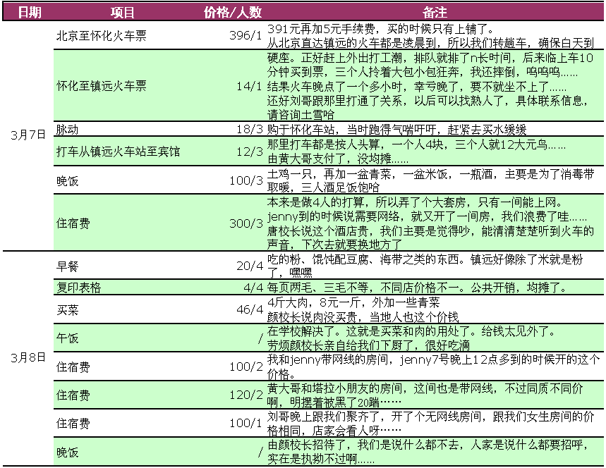 这次去贵州团队里的人虽然相处短短几天,却像老朋友般,再叫论坛ID的名字反而有点不熟悉了。所以记录的财务帐里面也都是按昵称来写了,呵呵。楚天湘云简称黄大哥了,我们的带队,真的很尽职尽责。君子就是刘哥了,经验丰富哇,不但指导我们走访的一些事,还教我一些为人处事的方法,真是太感谢了!塔拉繁称塔拉小朋友,因为此人在别人的一片恭维声中号称自己18……第二天又号称15…… ,年龄是不大,做事可是一板一眼,很不错滴!尤其是坐火车的经验很丰富啊,指导我怎么做火车,那叫一个详细,比黄大哥的流水账还详细,哈哈。接下来就是翁骏啦,叫jenny吧,回来之后才知道她论坛上叫jennyweng888,平时工作很忙,还抽空来做公益,期间晚上还工作,真的是辛苦的没话说……