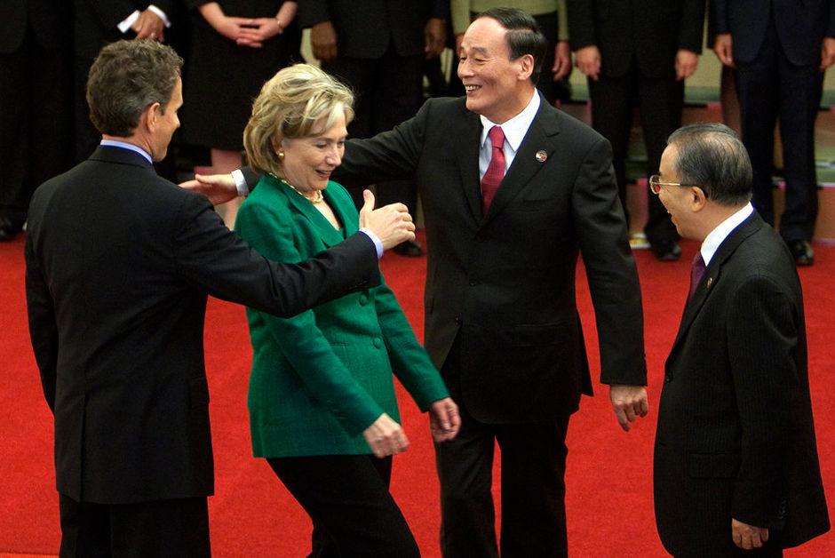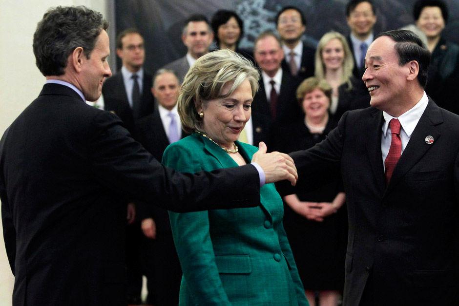 5月24日,第二轮中美战略与经济对话在北京开幕。图为开幕式上演了尴尬一幕,美国财政部长盖特纳(左)与中国国务院副总理王岐山(右)越过美国国务卿希拉里握手。