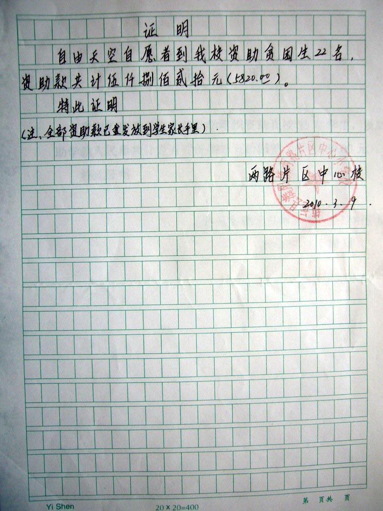 助学款的发放在当地学校领导和老师的见证下,由学生家长持户口本等身份证明文件签收。现公布如下: