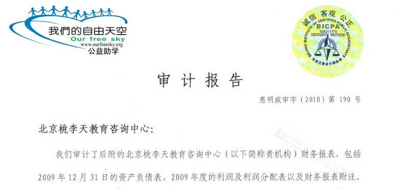 2010年,OFS聘请北京惠明威会计师事务所进行了2009年度财务审计工作。审计师对OFS的内部控制、财务核算以及相关信息披露进行了审计,出具了无保留意见审计报告。审计报告扫描拷贝见附件。如需影印件以及更详细披露的,请及时联系我们:ourfreesky.org@gmail.com。 ]z!Df\I