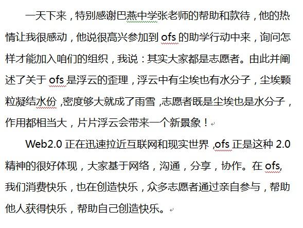 “其实大家都是志愿者。由此阐述了关于OFS是浮云的歪理,浮云中有尘埃也有水分子,尘埃颗粒凝结水份,密度够大就成了雨雪,志愿者既是尘埃也是水分子,作用都相当大,偏偏浮云会带来一个新景象!”说得甚好,只是能不能提俩建议?一“OFS”大写是不是更合适?二你的图片俺们想复制借鉴留言都不行……