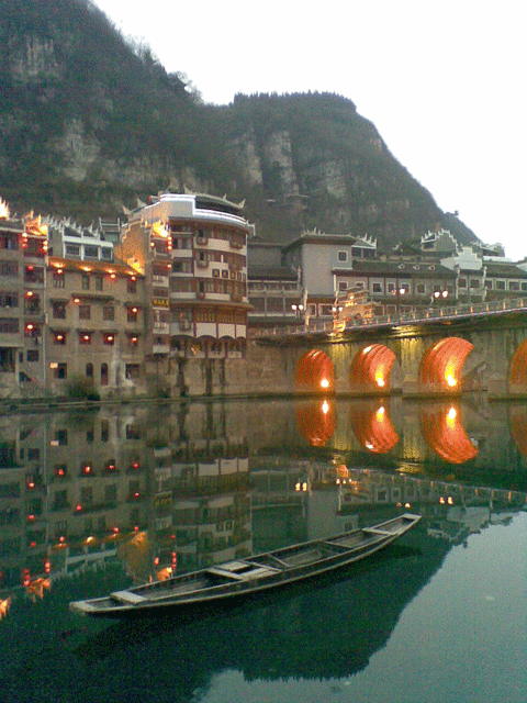 愉快而平静的28小时很快就过去了,“好心的”乘友在我下车前几分钟提醒我“贵州乱事多,千万要小心”,还好下车的不是我一个人,跟着一对母女我走出了镇远站,一出去便有很强的安全感。外面灯火通明、街道干净无染,在出租车上,好心的司机或慢速或停留,给我指舞阳河、青龙洞、新大桥……短短的十几分钟就让我喜欢上了镇远,这里的宁静和古韵已经将我从北京的喧嚣里完全抽离,要不是理智作祟,我真想下车细细浏览一番。街道两边的店铺都关门了,只有门外悬挂的灯笼与路灯共鸣。终于在唯一的亮点停下,本该零点就关门的老板娘一直等我到近凌晨三点,她看到车停下,就出来迎接,把我的大包抢过去,直接带我进了房间,微笑着让我早点休息就关门离开了,没有谈房价,没有陌生的客套,一切都自然亲切。