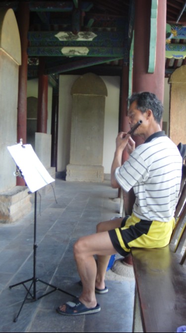 朱家花园恰好有插花艺术节,欣赏了一圈。兜转结束,直奔文庙。在文庙东碑廊遇到一位本地的吹笛人,这位叔叔的背影很寂寞,我第二次经过他身边时才忍不住凑近坐下。转过脸的他是那么的怡然自得。循声走去的那短短十米左右的路,居然走得一阵一阵的辛酸,眼泪几乎要涌出来。征得同意后,安静地坐在那儿聆听。叔叔休息的空当,给我介绍了《观家乡菜花黄》、《想延安》、《黄河边上的小妹妹》,以及《雕花的马鞍》的两个版本。叔叔说他也爱旅游,问到我是从安徽来的,就表示他去过黄山。老人一口咬定我是个爱音乐的人,会唱歌。苦笑告之,确实爱听音乐,但唱歌是天生走调。老人一笑而过,热力推荐《黄河边上的小妹妹》,说很好听,我想他是有个关于黄河的故事的。脚下打着拍子,在笛声中怅然。节奏越发高昂,似狂热追逐意中人的小伙子。曲调渐平柔,仿佛一个苹果脸的小姑娘巧笑出现。老人随后应邀为我唱了一曲小调《我的家乡在建水》,可惜用普通话唱的。听着听着,那活泼和深爱的自豪,让我想起自己刚在园子一个角落里蹲着捡食地上桑葚的傻样……老人最后吹了曲《永恒的诱惑》,边起身收拾器具,边告诉我:人活着就要快快乐乐。一下子把我又说心酸了。 !+?,y/*5(