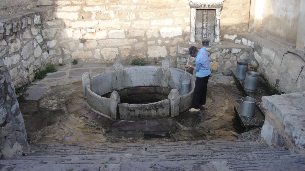 离开文庙,一路绕回仿古街,天黑之前去寻找那个有六百年历史的甜水井。正在踌躇如何品尝那井水时,一位来挑水的老人拎起一桶水,问我要喝不,我说没带杯子,老人教我趴桶边直接喝……哈哈,虽然略有悬浮物,但确实水质比较润滑,丝丝微甜,泡茶一定是上水。 L6^Qn%:OTd