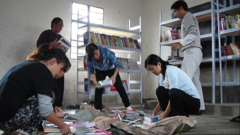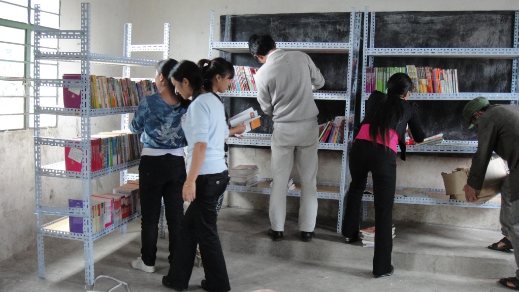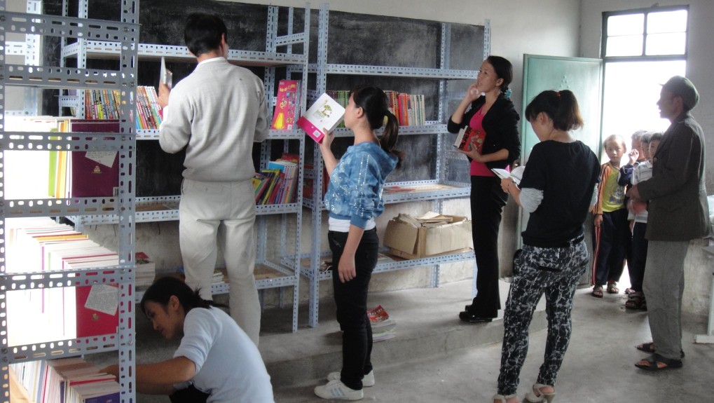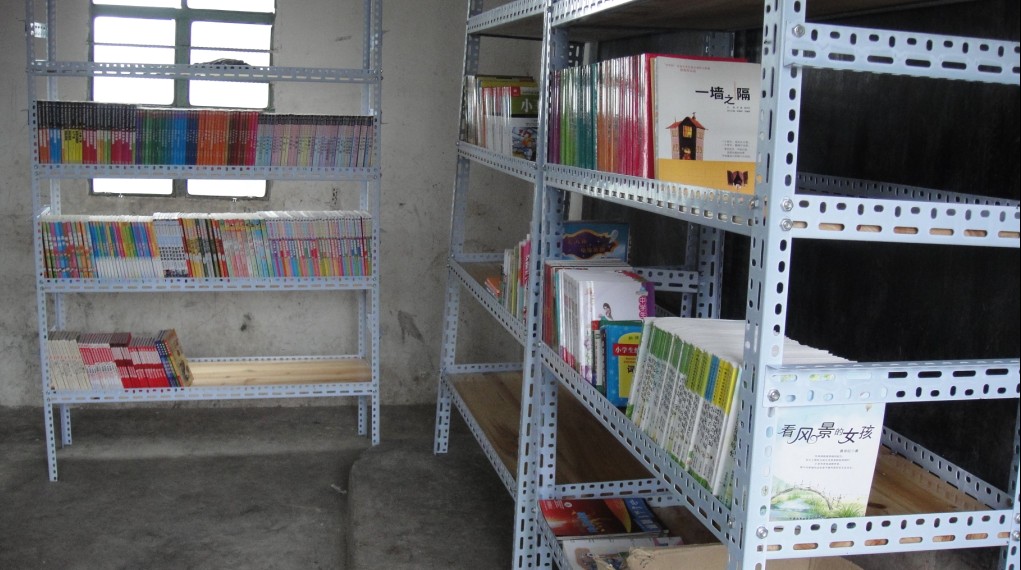 2011年9月2日,马马小学开学第2天,根据上学期要求,学校任课老师(5名)全部出动,安装金属书架、整理图书上架。