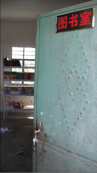 为了保证图书室的规范化,学校重新修缮了该房间的门锁,并张贴“图书室”门牌。
