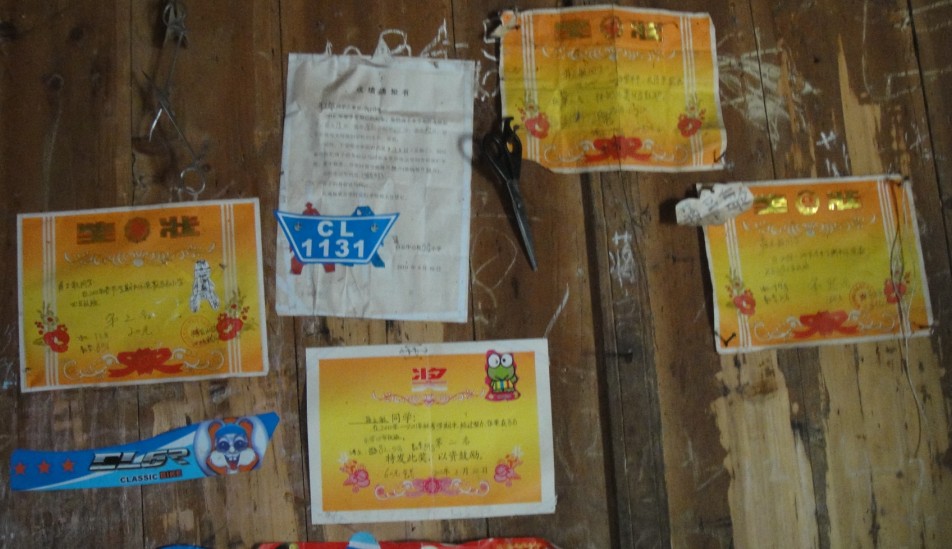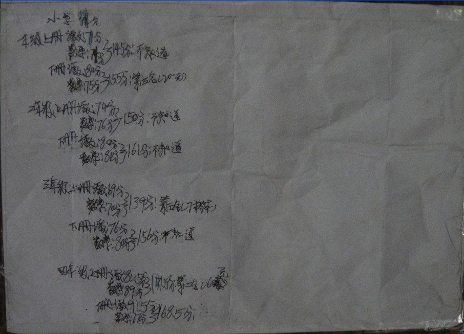这个孩子在马马小学读五年级,比较踏实,成绩处于靠前位置。到他家时,我们看到了墙上的奖状,每学期一张,四年级下册没发(因为有关部门要求不能排名次);这些都不是关键的,关键的是孩子的奖状是自己贴在木板墙上的,还有心的把小学时期每学期的成绩都记在下面一点的纸上……