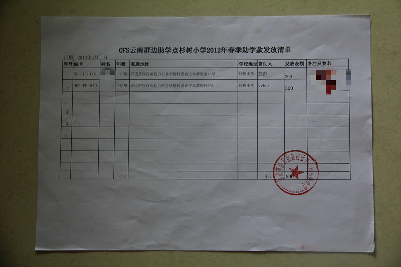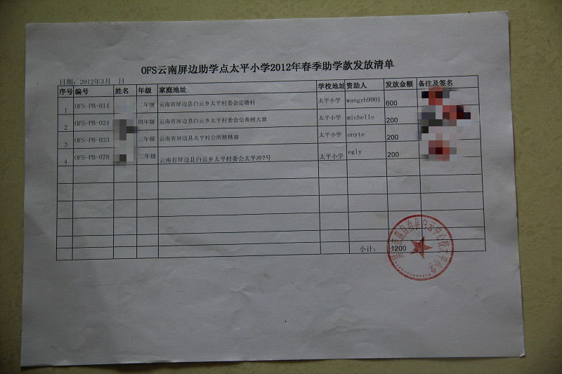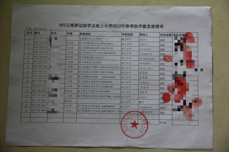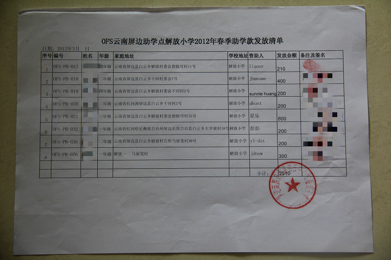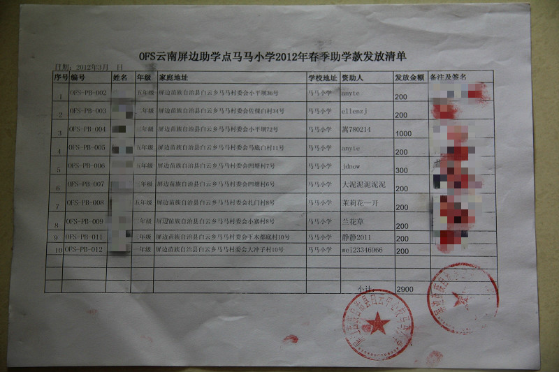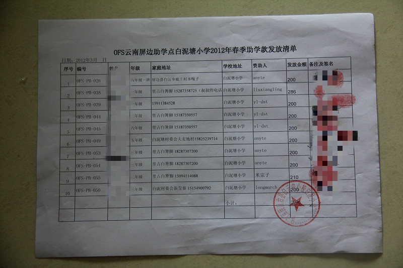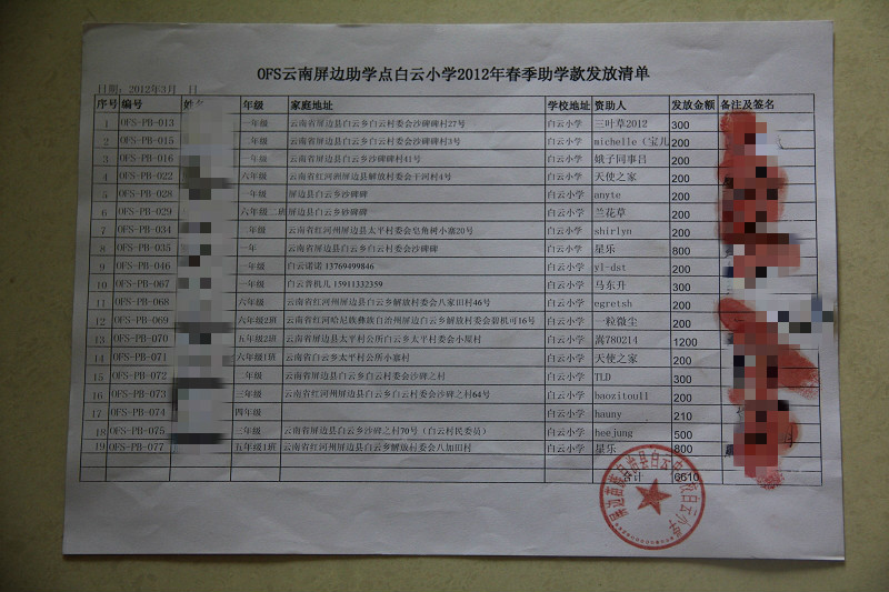 云南省屏边县白云乡助学点2012年春季走访助学款发放清单公示 [复制链接]
