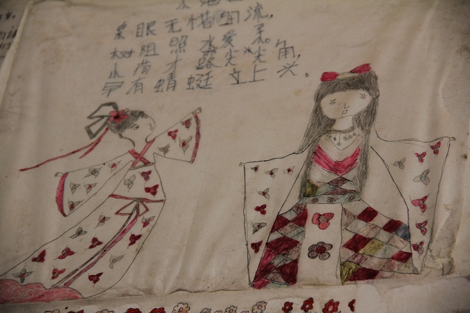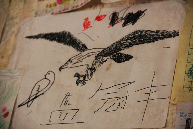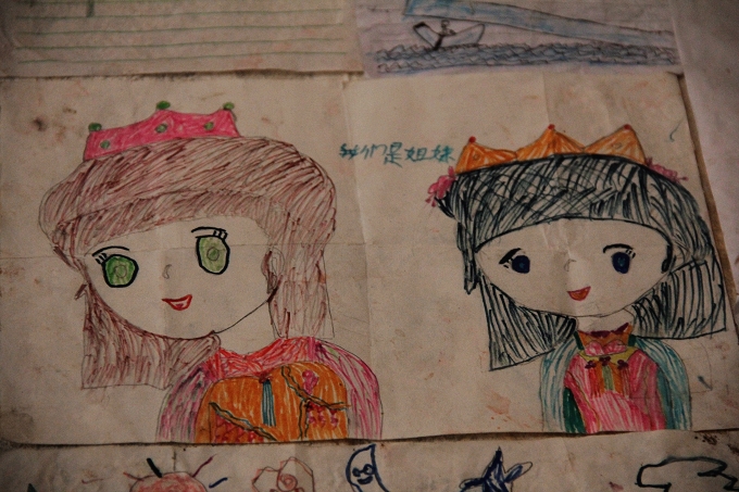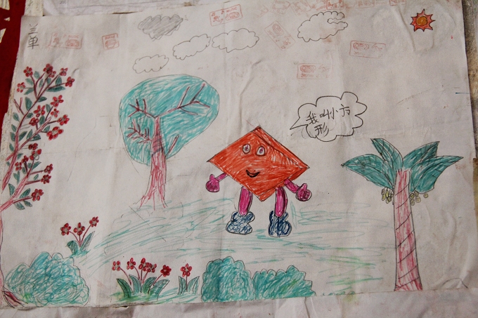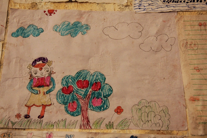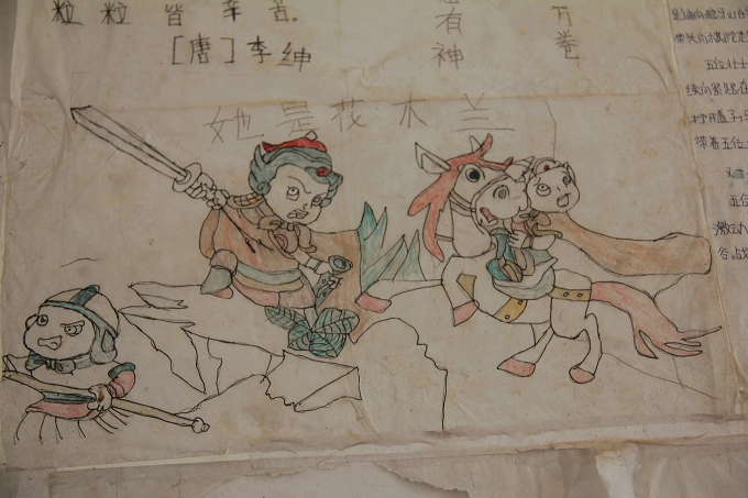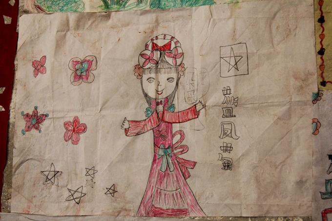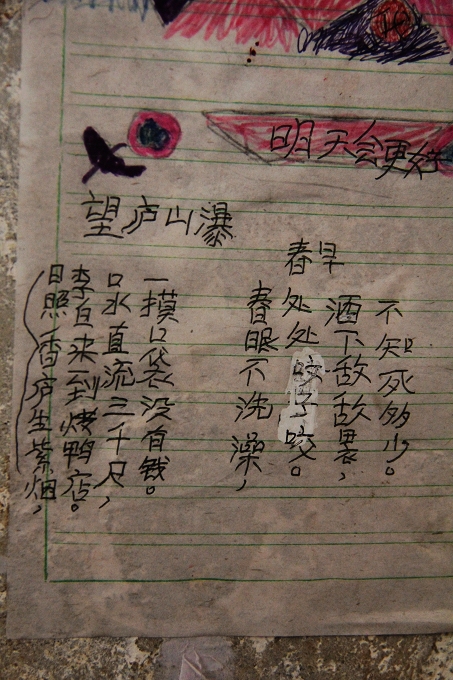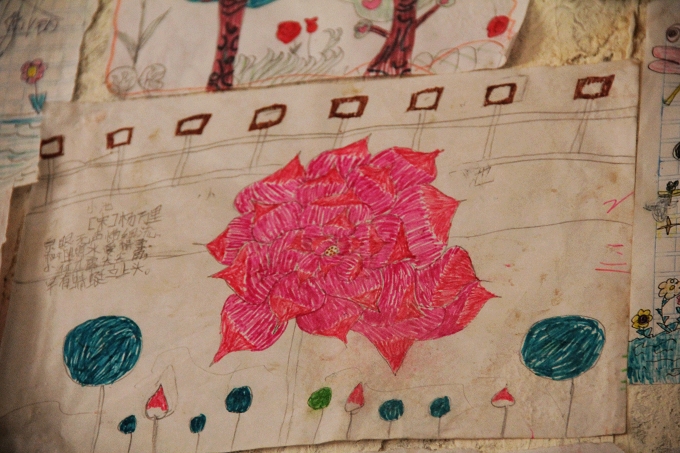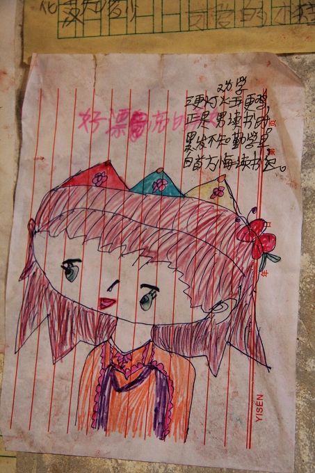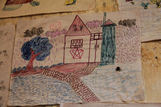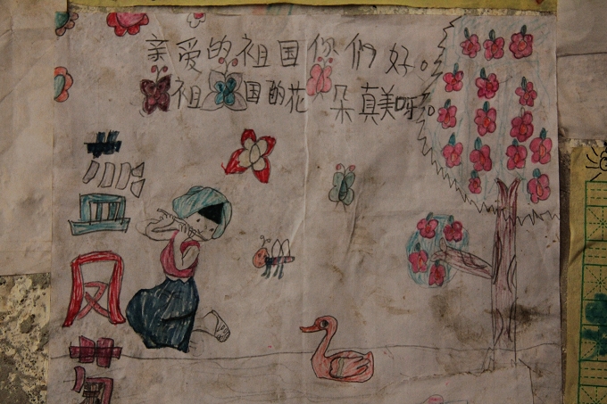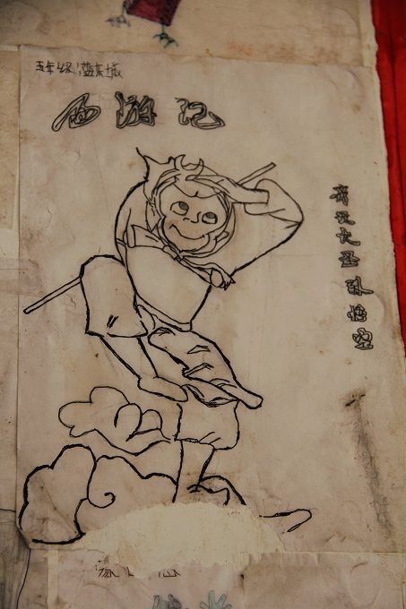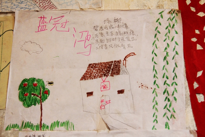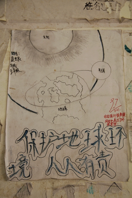 这是一些不被重视的作品,它们被经久地贴在教室后面的墙上,早已斑驳。