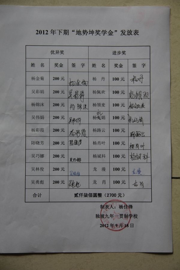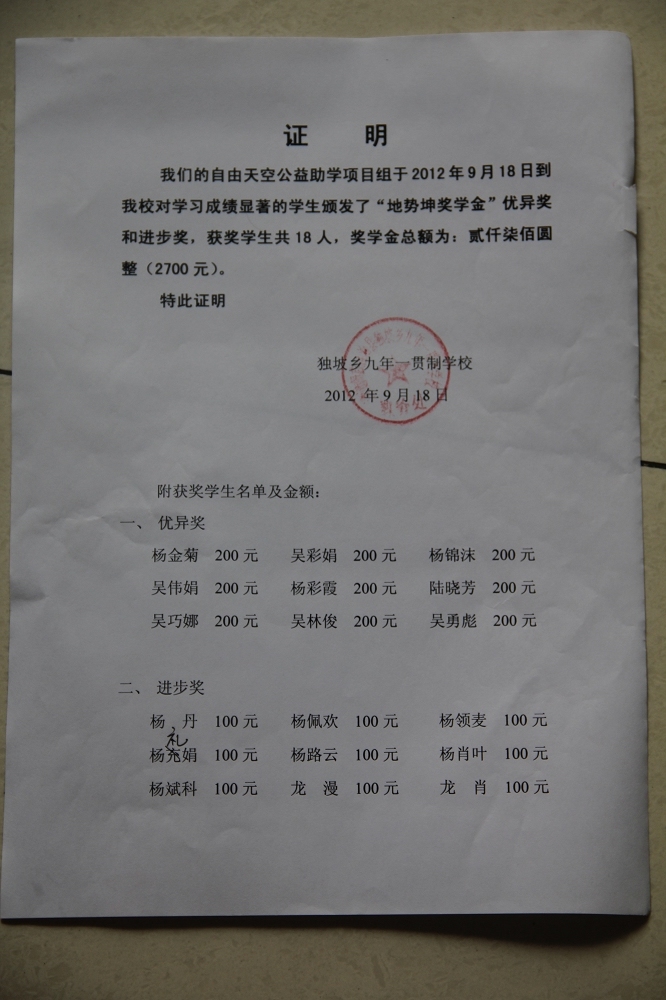 我们的自由天空公益助学项目组于2012年9月18日到湖南独坡地势坤学校,对成绩显著的学生颁发了“地势坤”奖学金优异奖和进步奖。获奖学生共18人,奖学金总额为二仟染佰元整(2700元)