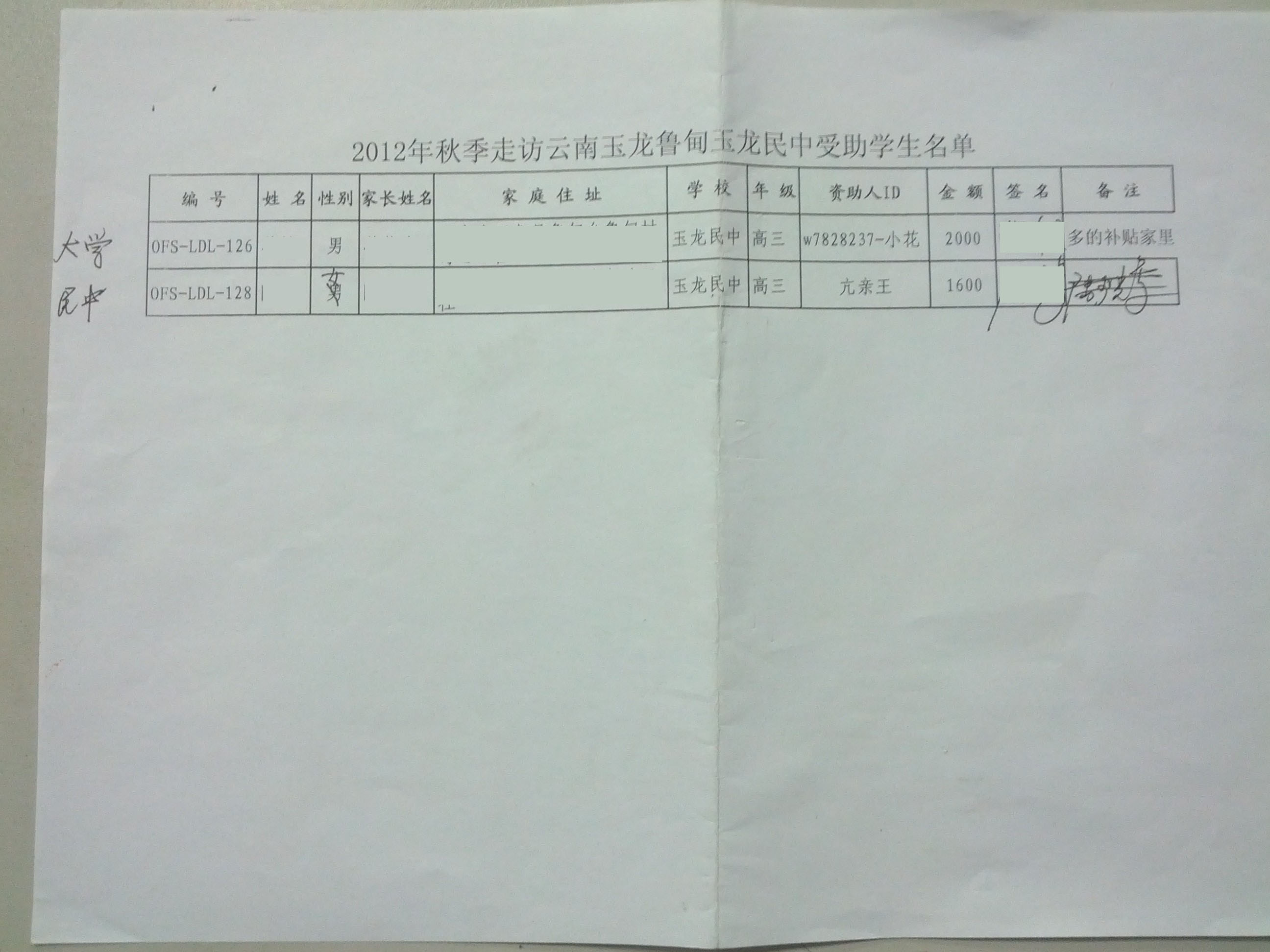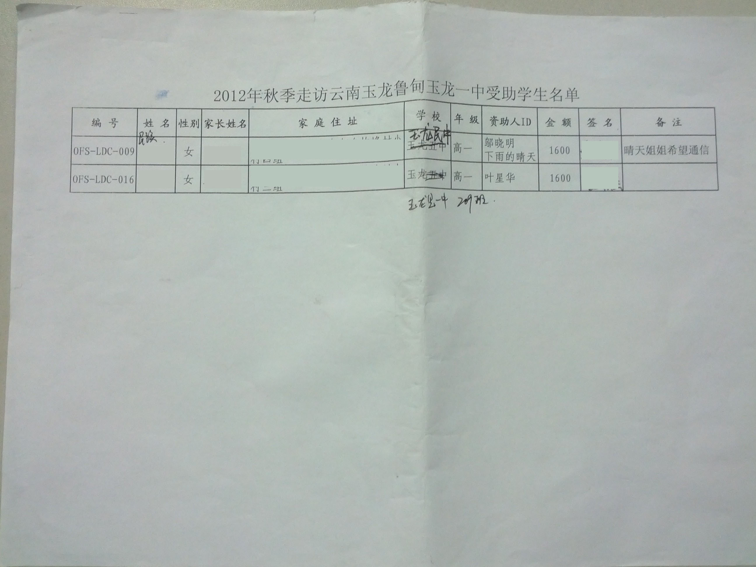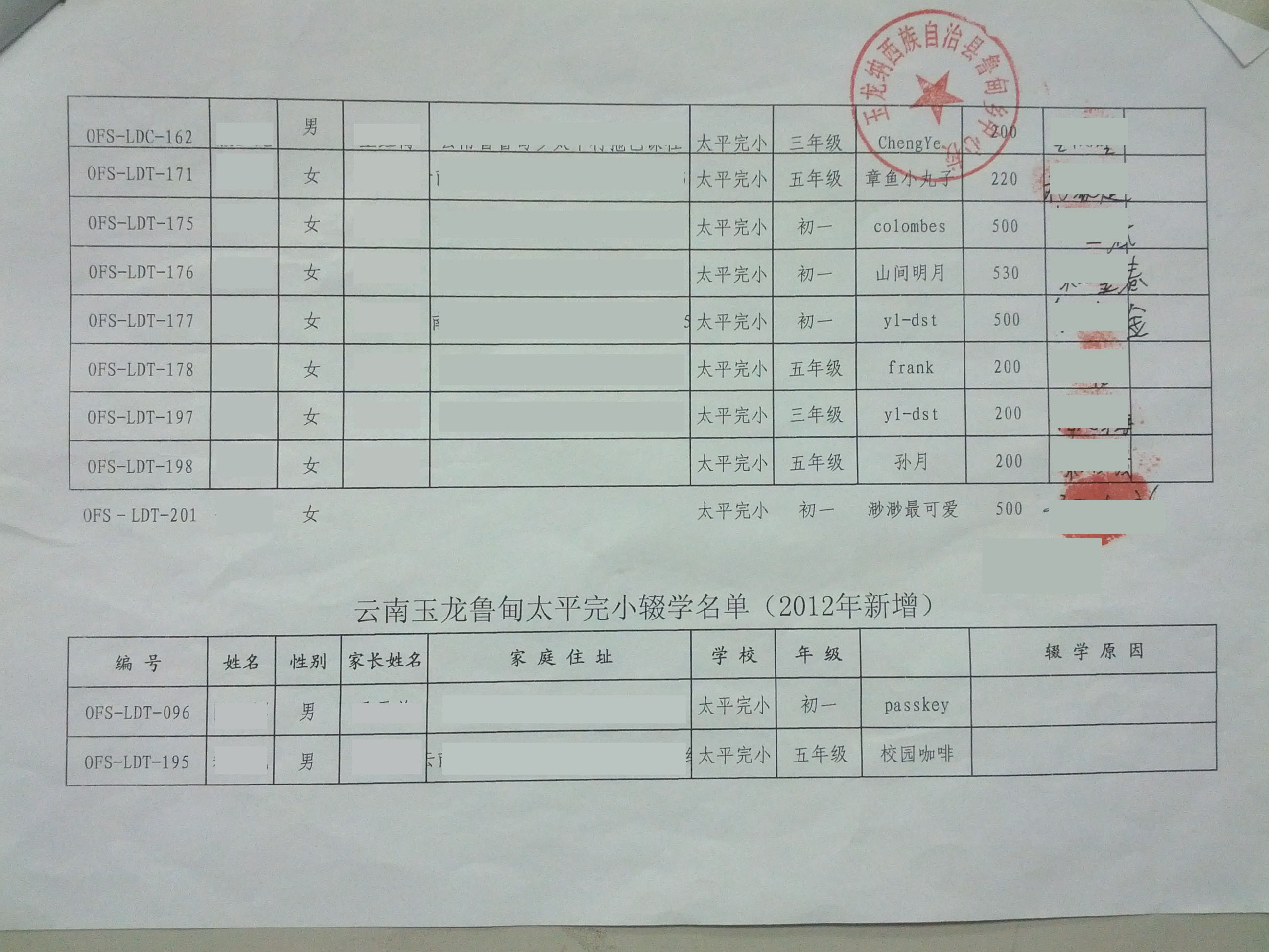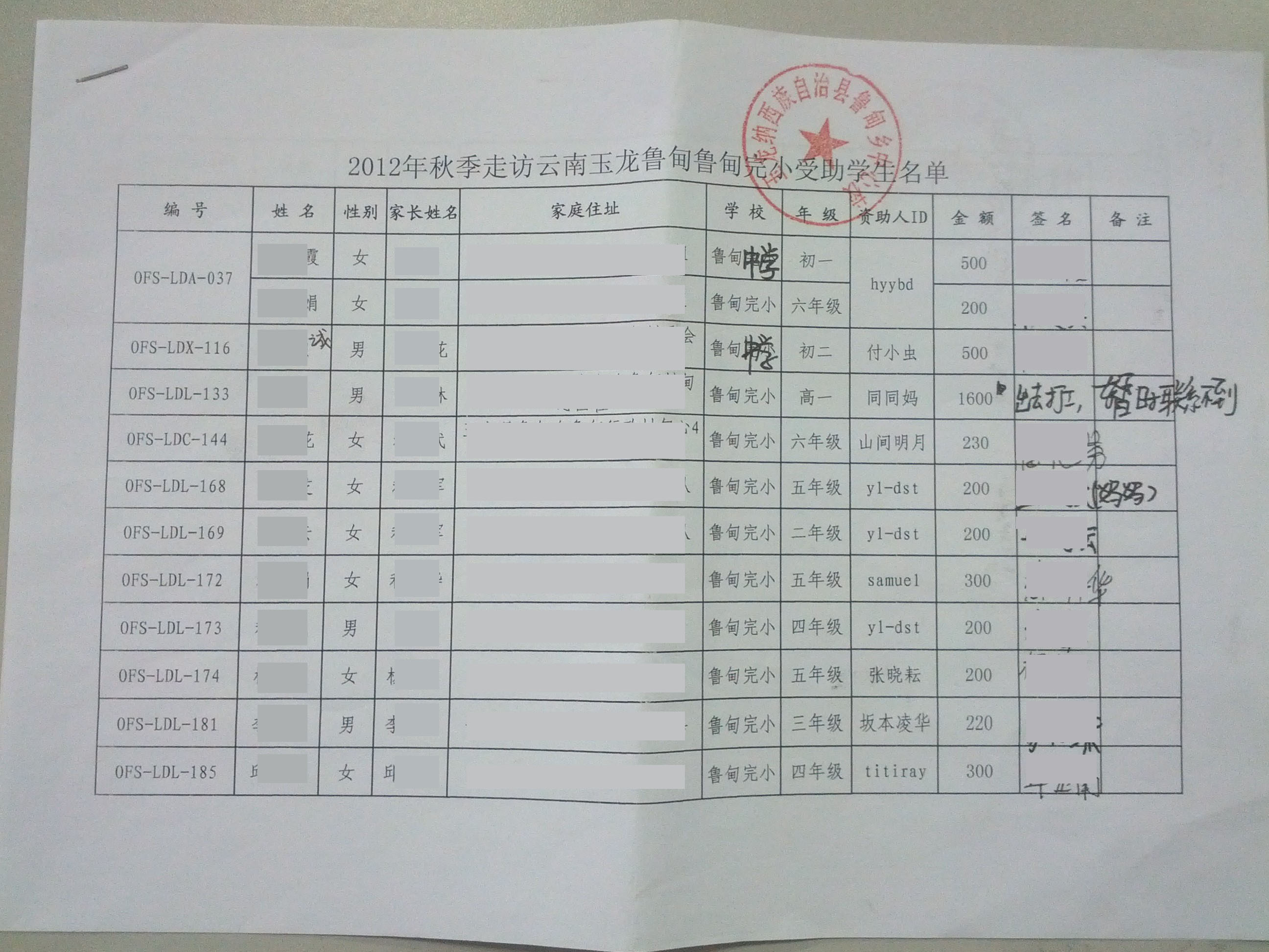 OFS的志愿者在2012年10月份对云南鲁甸助学点进行了走访及发放助学款。 :et#0!