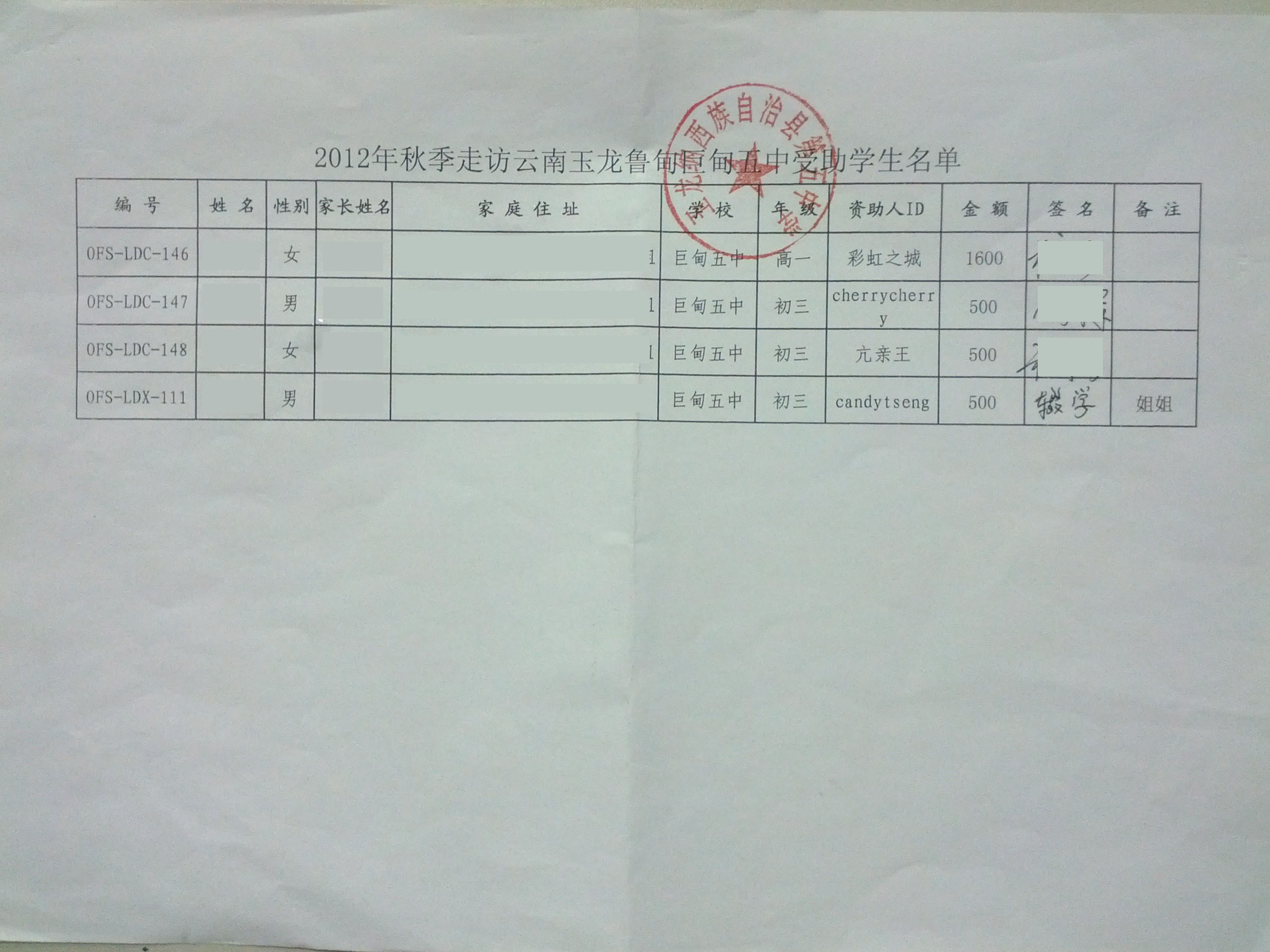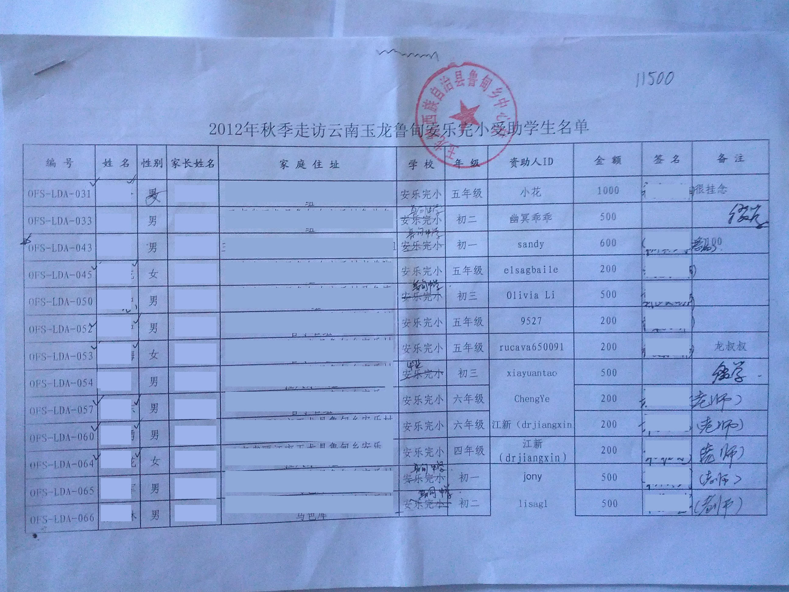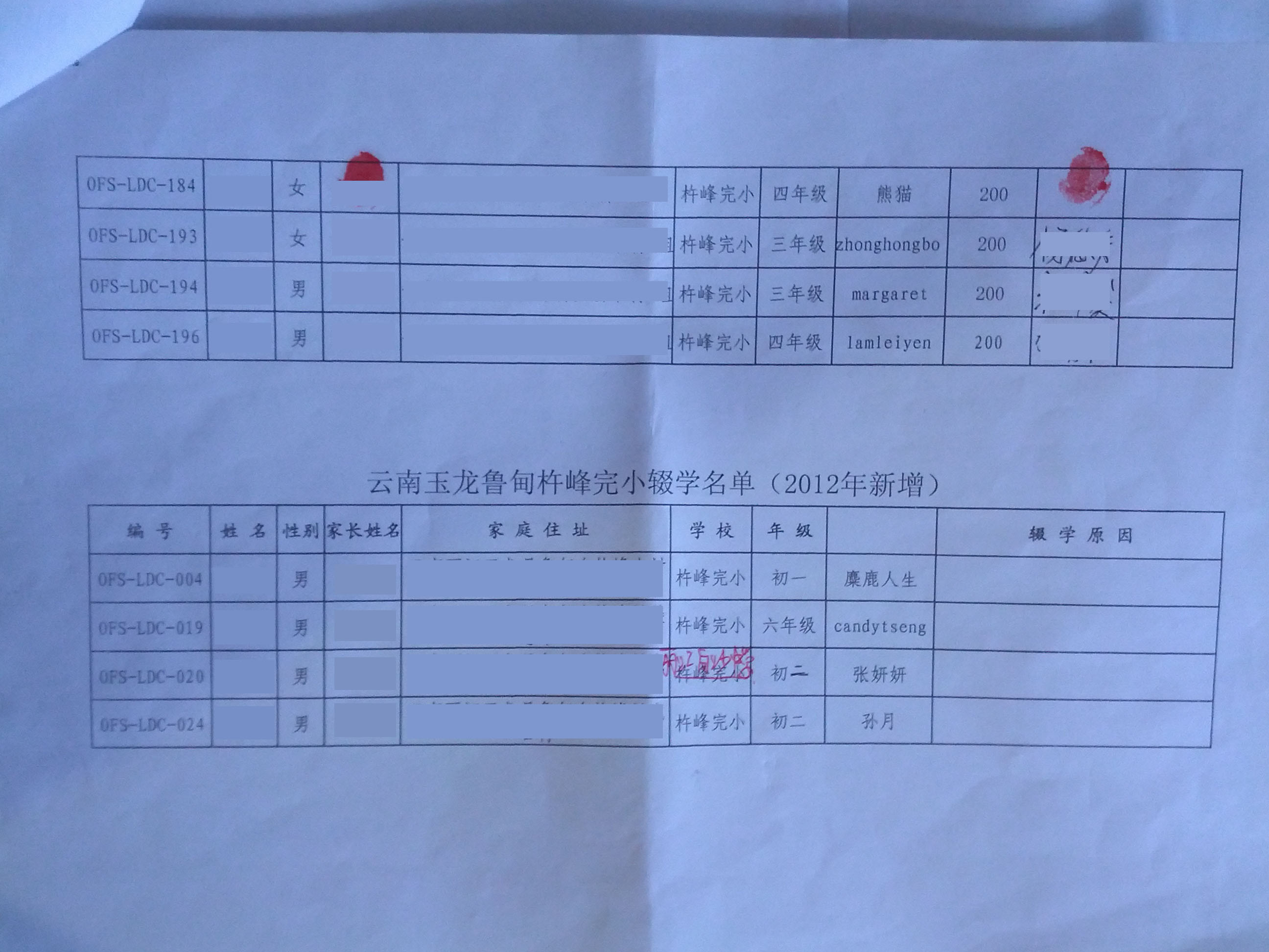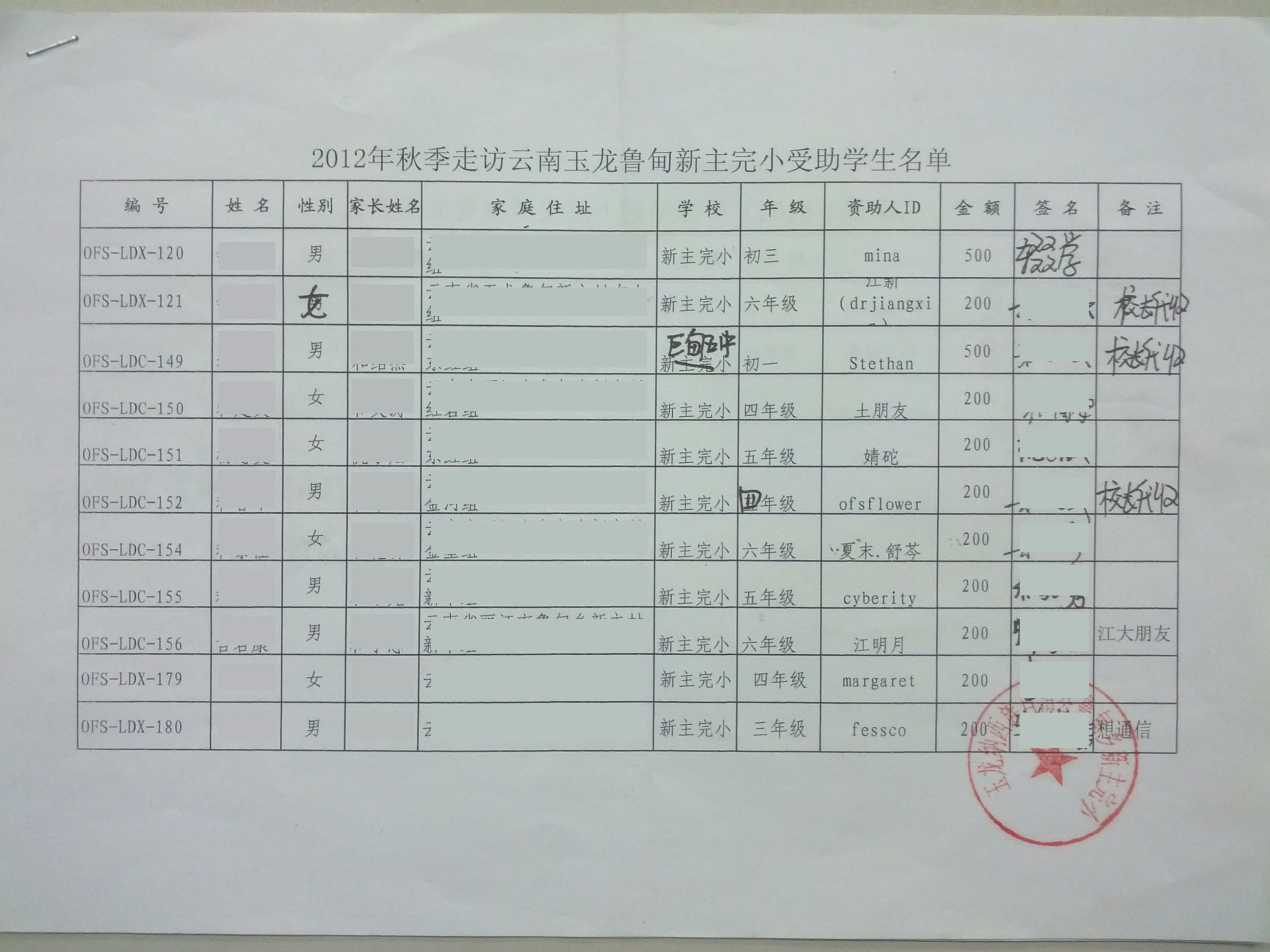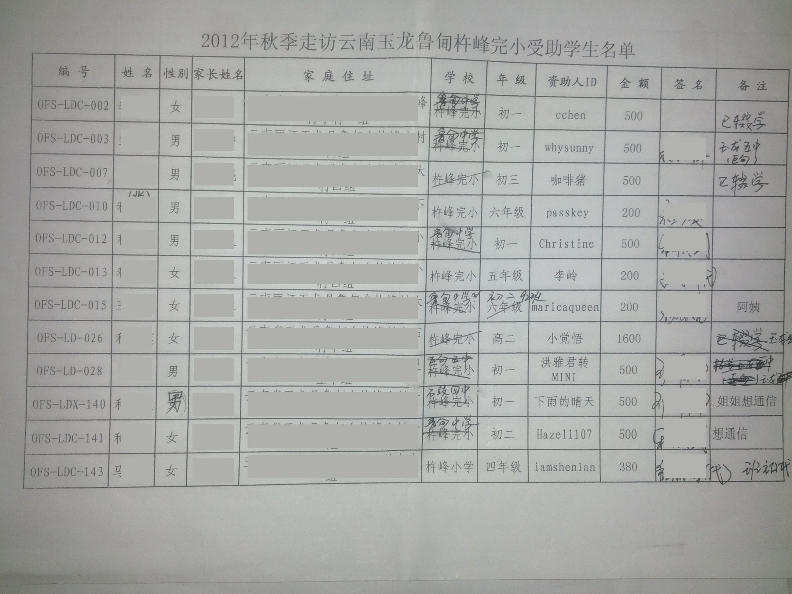 OFS的志愿者在2012年10月份对云南鲁甸助学点进行了走访及发放助学款。 :et#0!