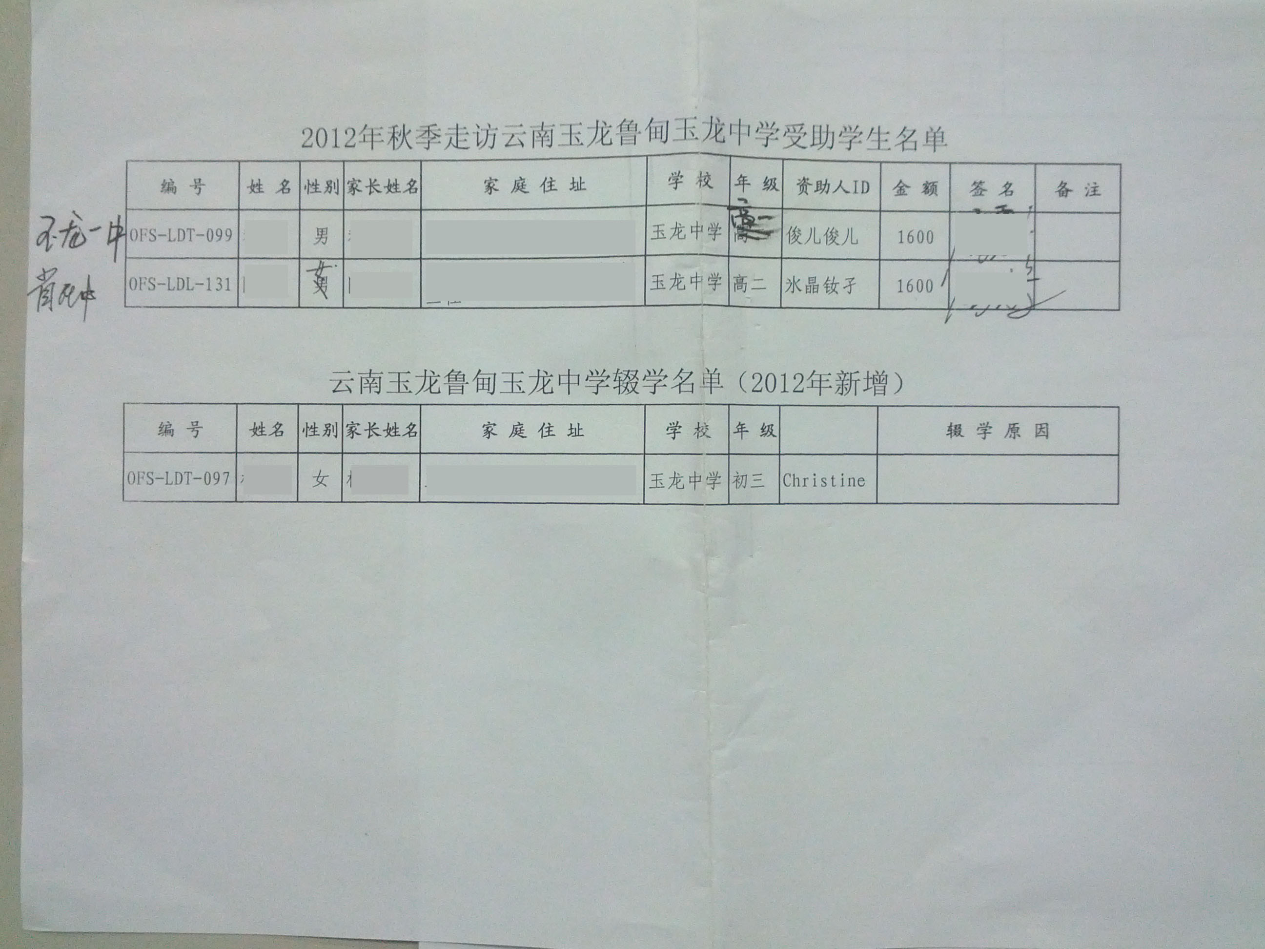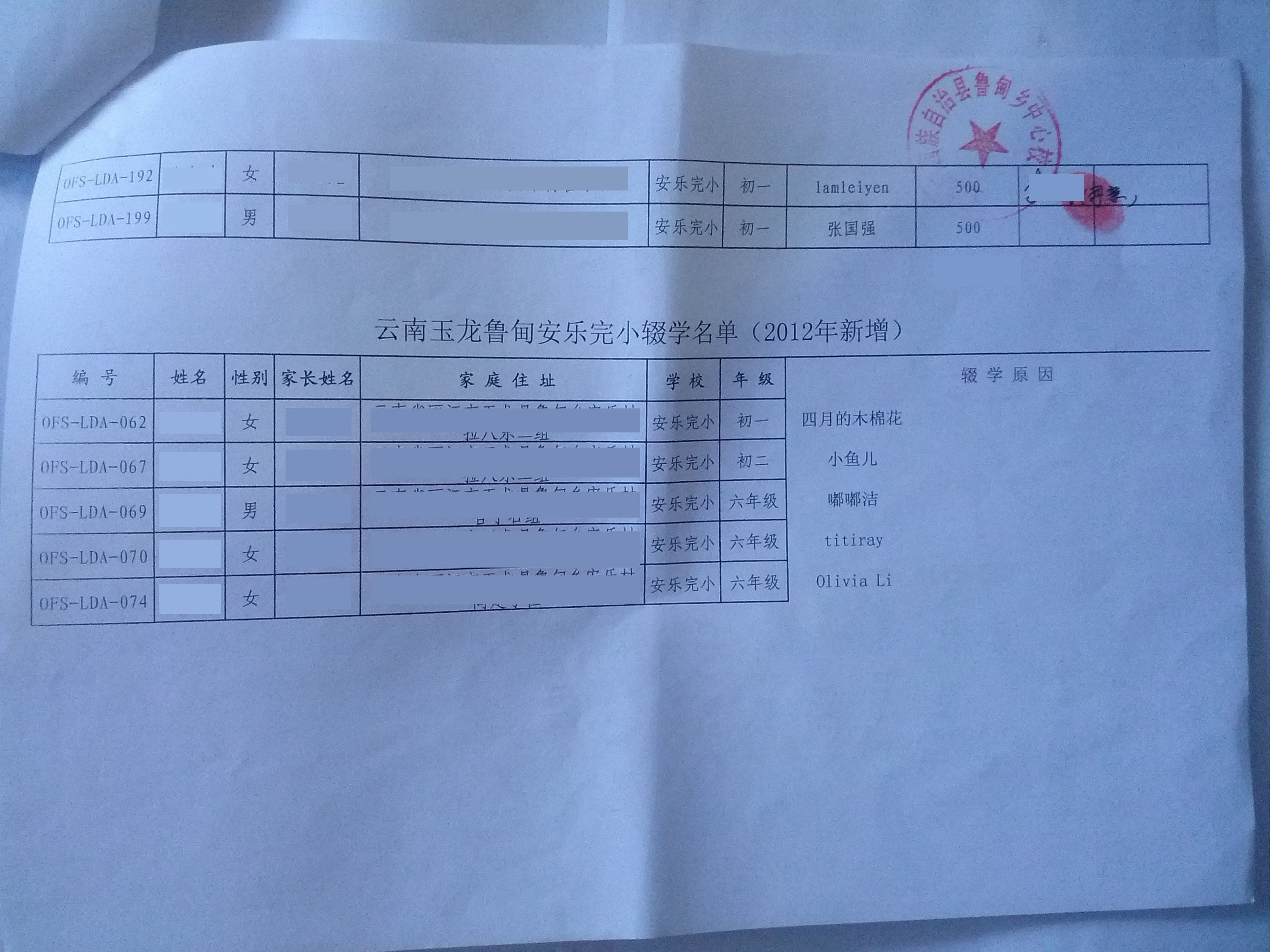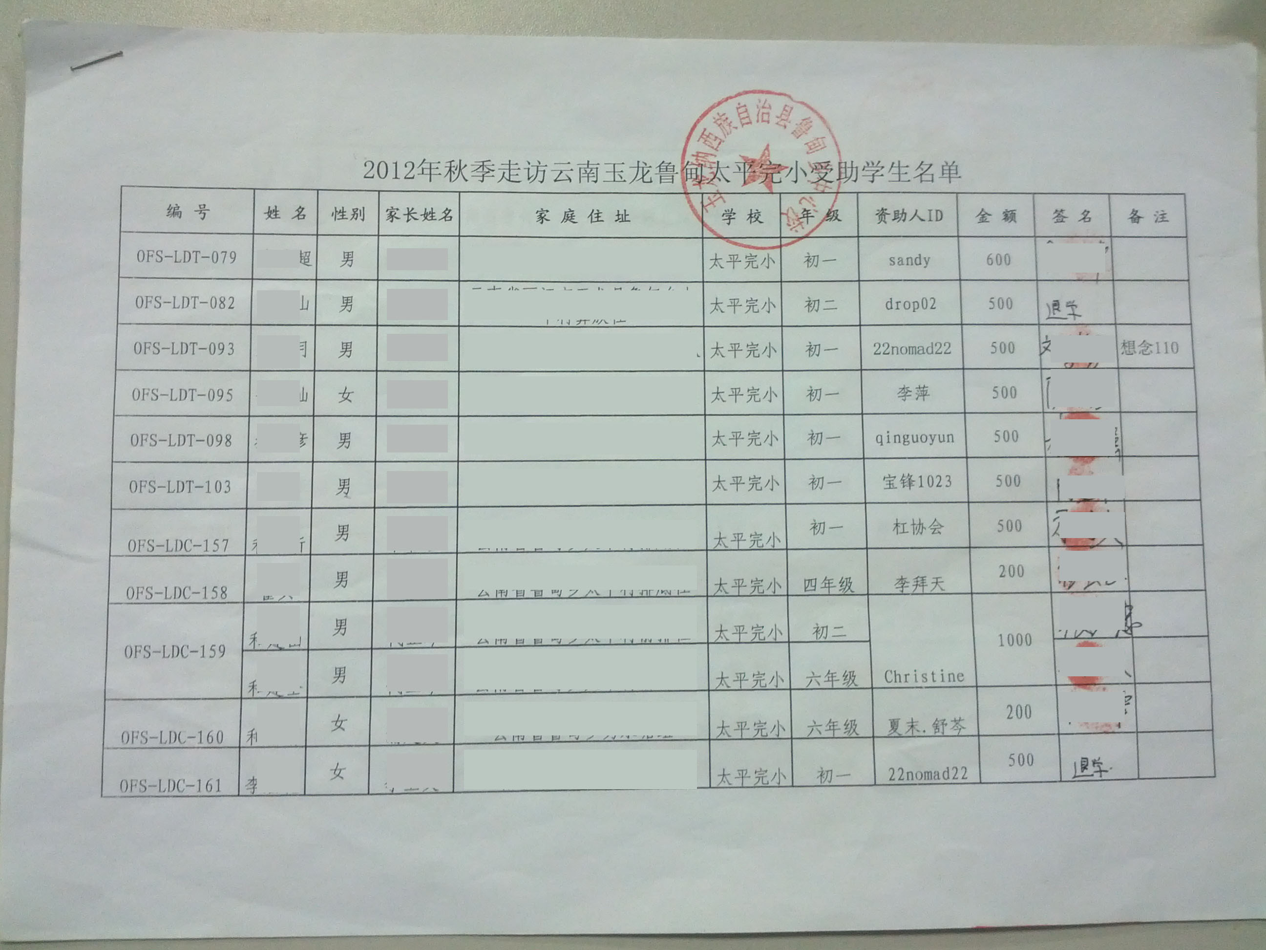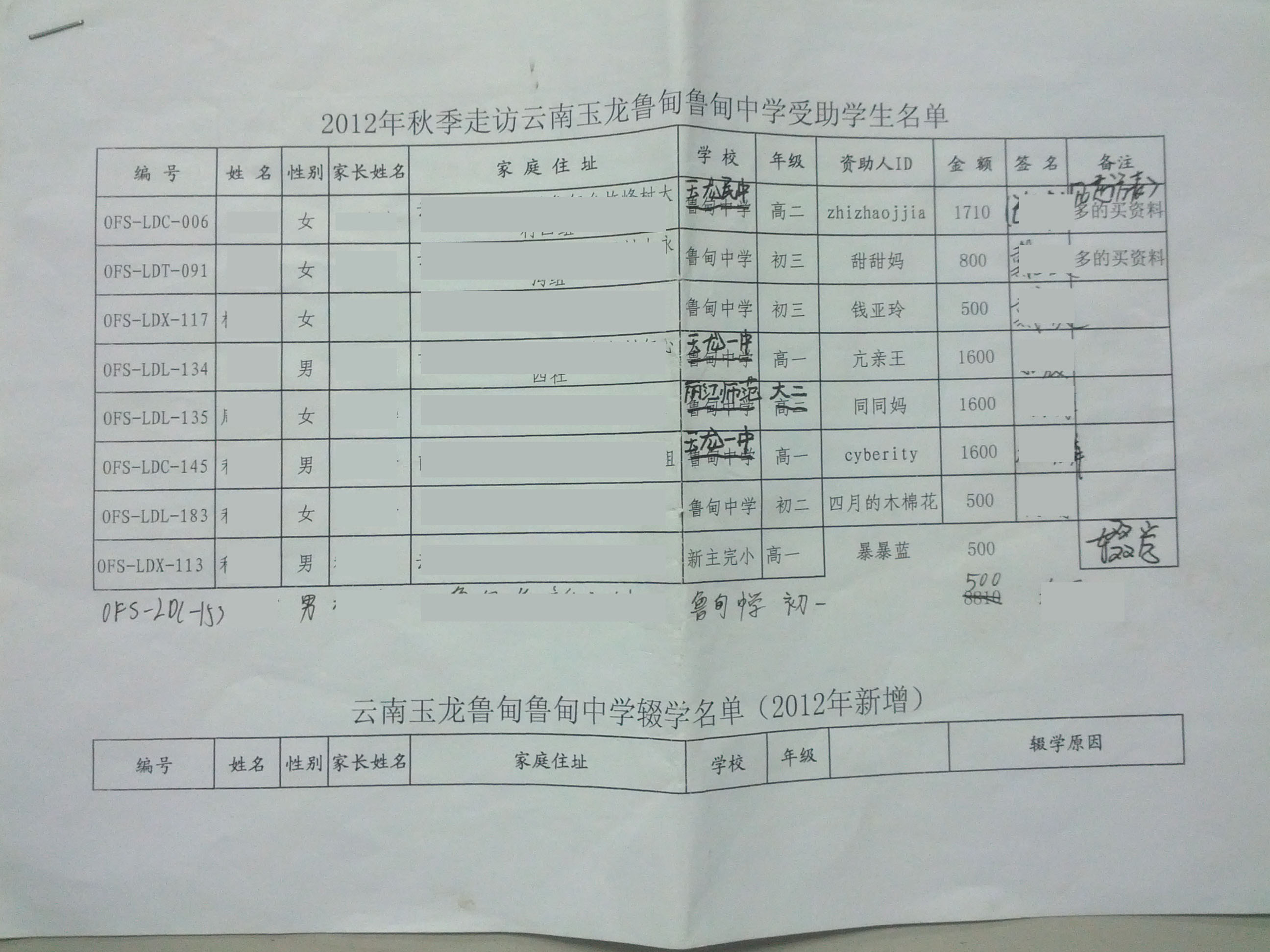OFS的志愿者在2012年10月份对云南鲁甸助学点进行了走访及发放助学款。 :et#0!
