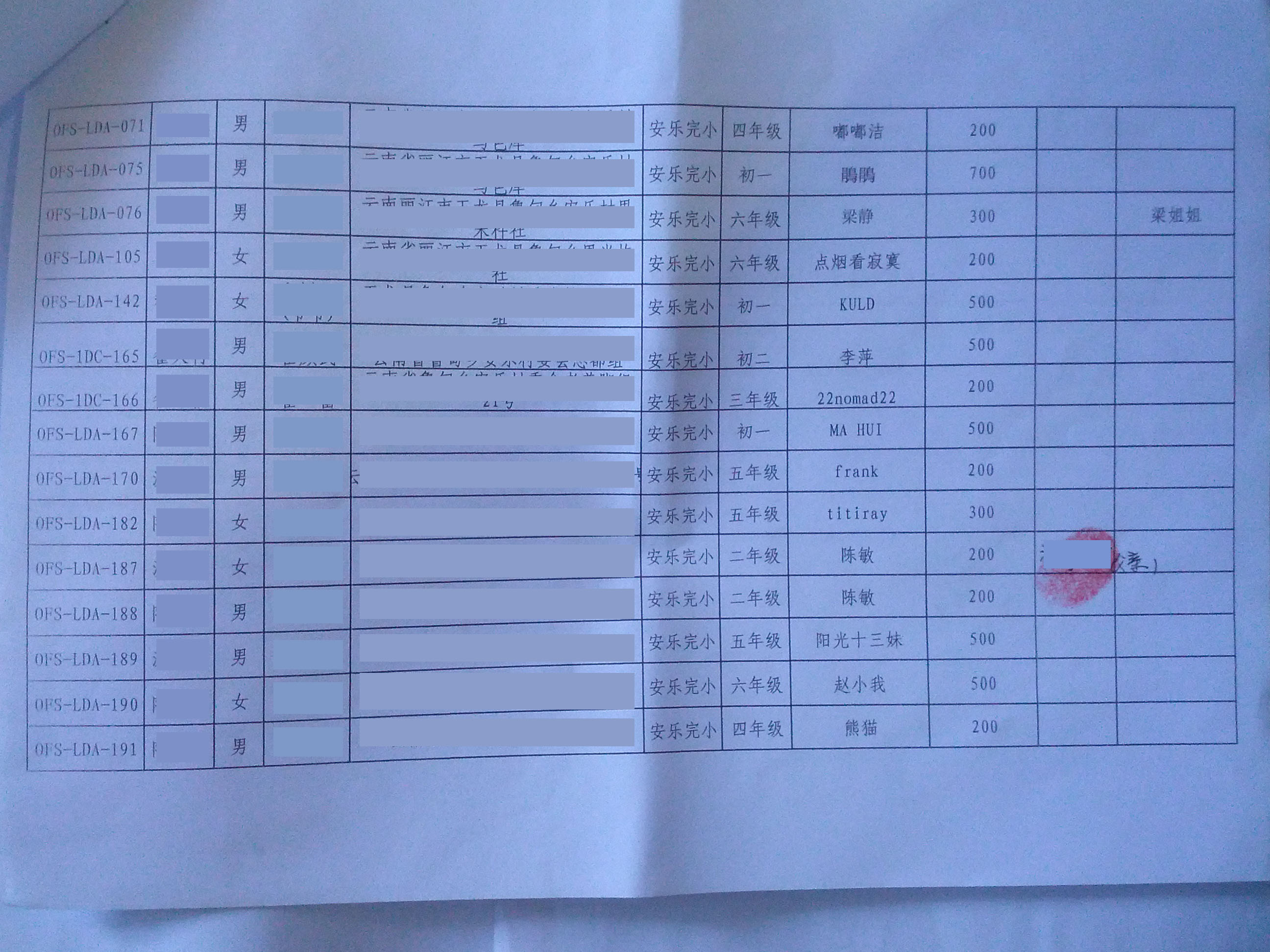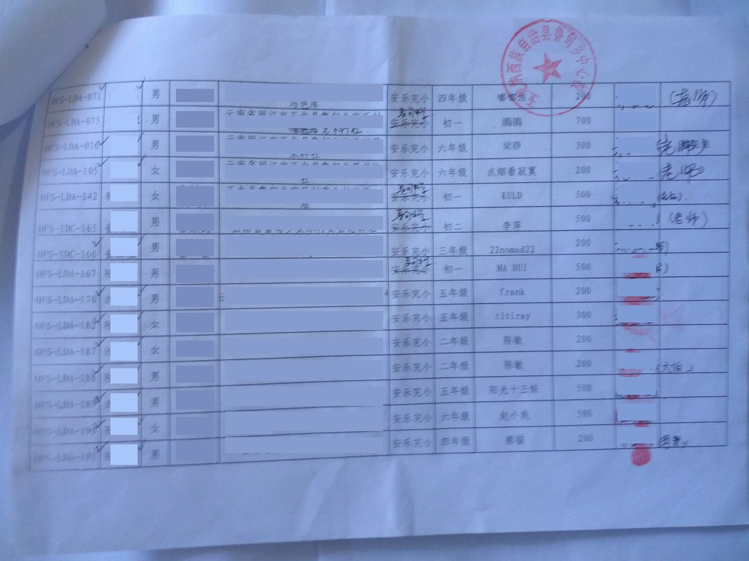 另以下清单为保护受助孩子隐私,重要信息均做遮挡处理,如有资助人希望查看清单原件,可单独与我处联系,谢谢。 :,S98z#