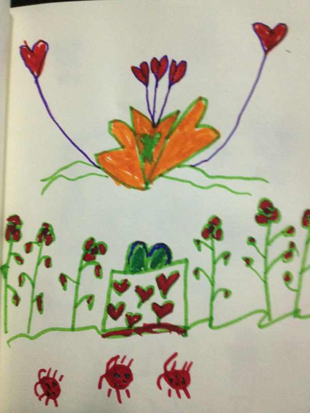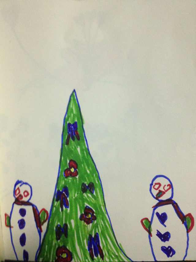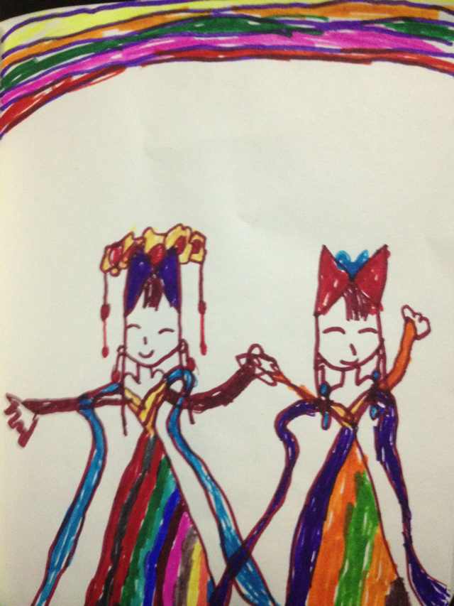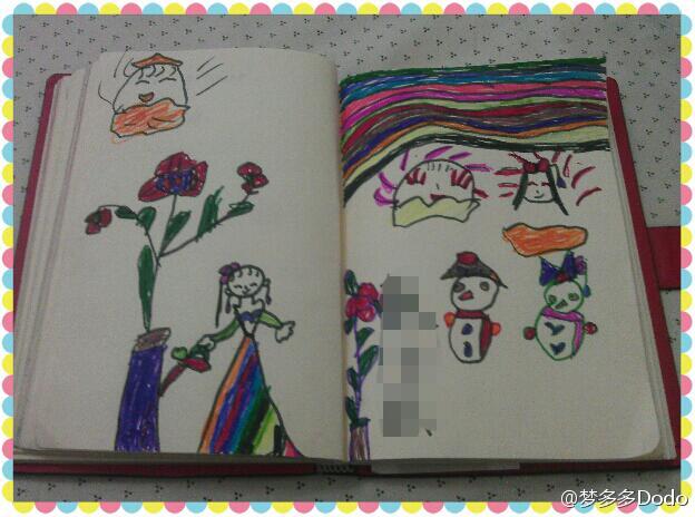 真正跟她接触是第二天出发前,她到我们房里来。那时候我和另一个志愿者小不点还没起床(羞愧一个先),她就一个人乖乖地坐在电脑前看动画片,也不吵,也不闹。过了一会,她跟我说想画画。我就找了个本子给她。她趴在那里,一笔一划认真地开始涂绘。我和小不点就管自己整理房间,当时心里的想法是,这孩子太乖了,根本不用人管嘛。整理到一半,往本子上一瞥,震惊了。孩子画了一个彩色的天空,一层一层的,非常漂亮。然后她又在下面画了两个小雪人,一个太阳公主,一个太阳王子。小不点看了自愧不如,我们都被孩子的艺术创造能力震撼了。都说孩子是天生的绘画家,我想,蒙蒙可能就是一个吧。