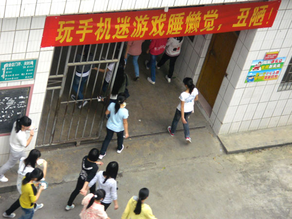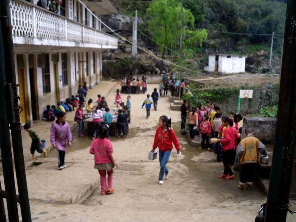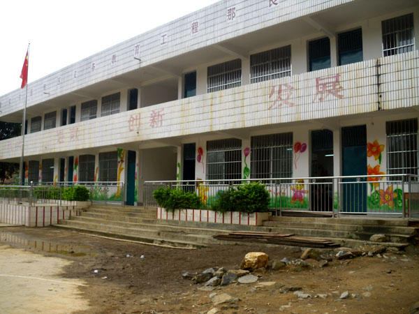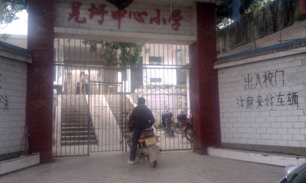 接着,老师骑摩托车载我和毛老师去羌圩中心小学,刚到校门口,就看到校门打开的同时好多学生边沿着高高的台阶向外奔边向我们大声喊“放学了…”我看了看表不到10点,正在纳闷,摩托车老师说,现在是课间休息时间,他们是去校外小卖部买零食,等待的功夫便看到有人陆续拿着小吃或作业本返回了….