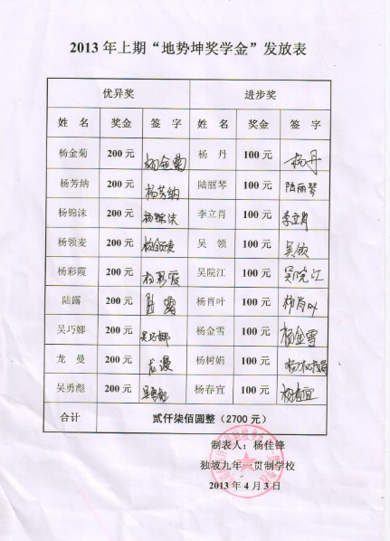 [公 示]2013年春季湖南通道独坡九年制学校地势坤奖学金发放公示 [复制链接]