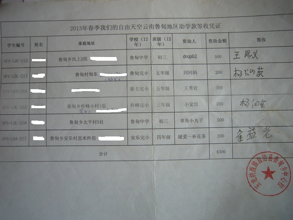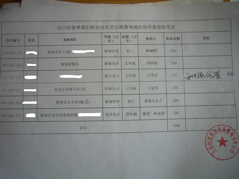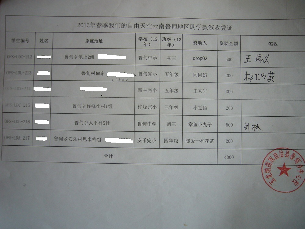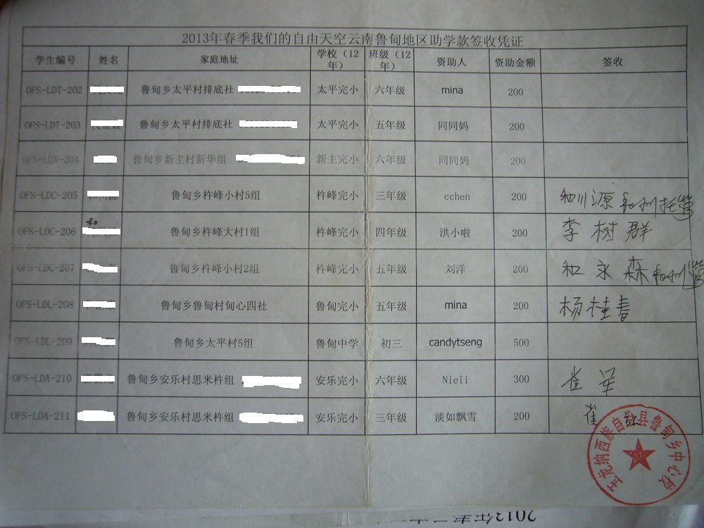 OFS的走访志愿者在2013年4月份对云南鲁甸助学点进行了走访及发放助学款,此次发放的助学款 92-I~ !d