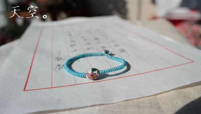 淡色明朗的水蓝色蜡线,配合景泰蓝老珠子,像是晴朗天空,如孩子般明媚的色彩。结尾处也用天蓝色调小珠收尾。
