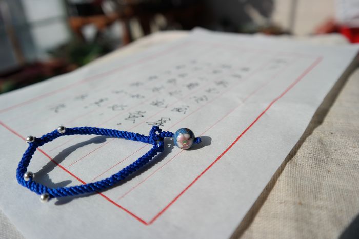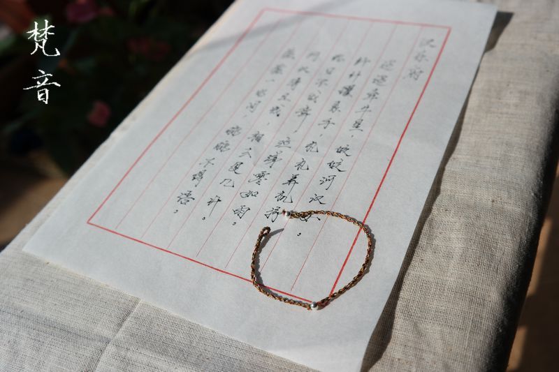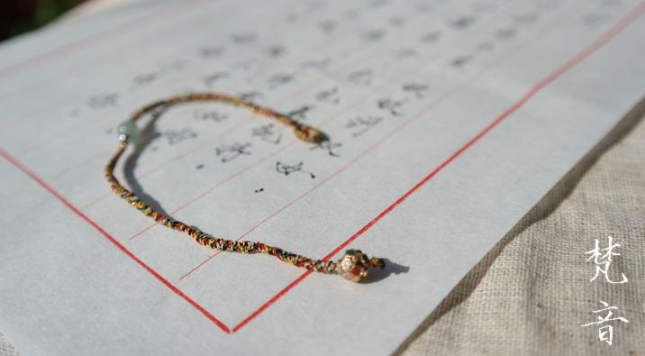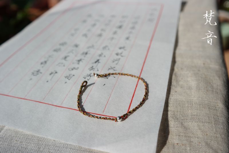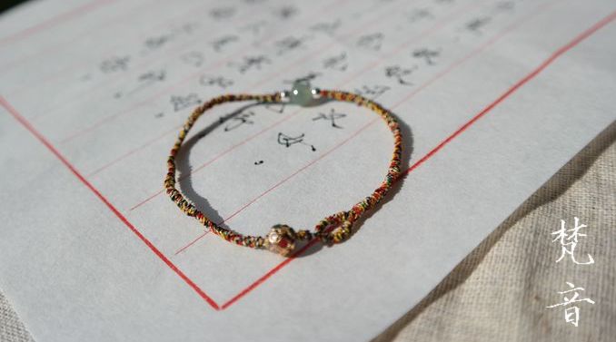 这组手绳是用加了金丝的五彩佛线编织,很细致,戴在手上没什么感觉,但很显眼。佛线极细,编起来费时费力,所以所见即所得,不做修改了。