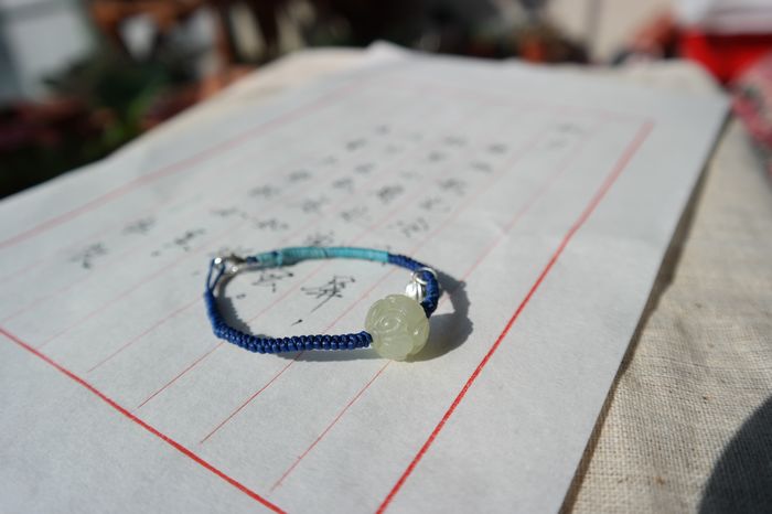 这个用的是进口蜡线,特点不脏不臭,外面有一层蜡质,佩戴过程中会慢慢脱落,蓝色会越来越亮,当中的也是北京老货岫(同“秀”音)玉,不是很值钱但是也不怎么见,边上是990纯银的莲蓬小坠子,拍卖前会把后扣子换成990的。