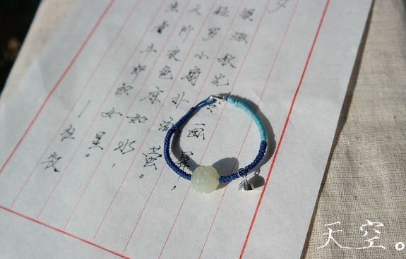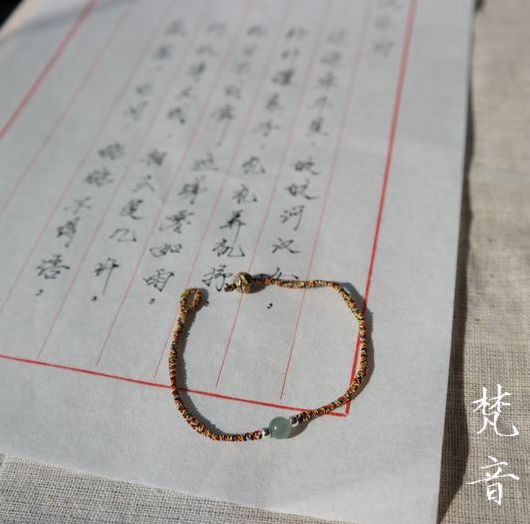 中间小玉珠,收尾金色景泰蓝珠子,以金刚结编织,妈妈说很细巧。。