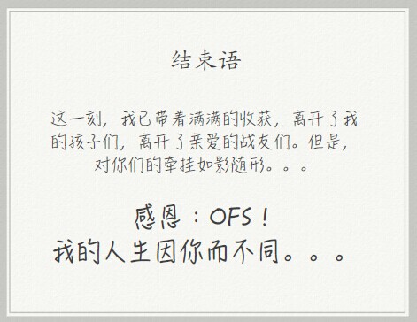 这一刻,我已带着满满的收获,离开了我的孩子们,离开了我的战友们。但是,对你们的牵挂如影随形……感恩OFS,我的人生因你而不同!