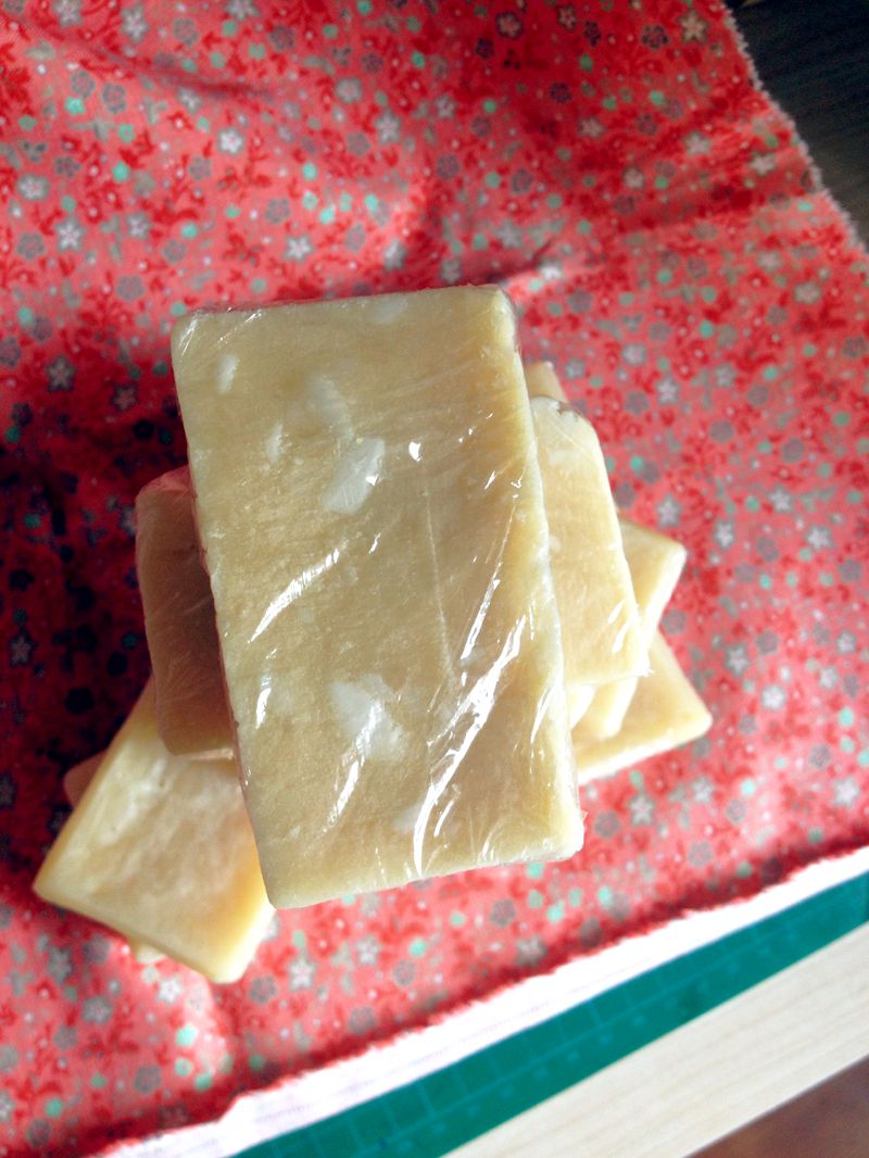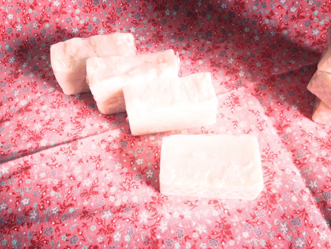 研磨皂是将原先的皂刨成丝,再加水,牛奶或者其他液体,隔水蒸至皂丝软化,在搓成团。在这个步骤里,皂经过再一次的受热,碱性进一步的降低,使皂变的更加温和。后期加入的水相也因没有参加皂化反应,各种有效物质未被破坏而完整的保留下来。这款皂后期加入的就是白茶。 r Q