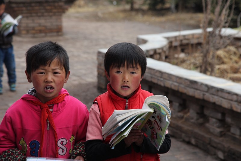 (南门峡某个稍微大一点的小学。因为班里的老师有其他事情要应付,只好让孩子们跑到老师办公室外面来背书,背书了的就进办公室找老师背。于是走廊上、草坪里,挤满了朗朗读书的小孩子,很可爱。这个学校集中了附近几个村里三年级到五年级的孩子。孩子上到六年级之后,就会转到另一所初级中学)