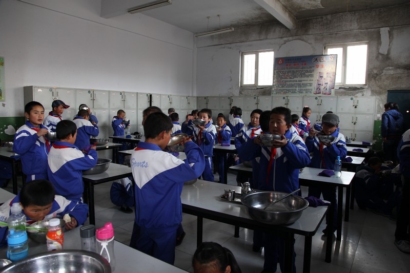 (巴燕中学的饭堂。因为饭堂太小,没设凳子,学生都站这吃饭。在巴燕小学看到也是如此。中学的学生比较多,学生们只能分批吃饭。学校给孩子们提供免费的汤水,汤水里有些大白菜、土豆条、大肉之类的东东。我第一天中午的午餐就在学校的教师饭堂。教师饭堂更小,有主食提供,但每个老师必须交一定的伙食费,不多,好像一餐几块钱。学生的主食好像必须自带。有些孩子就光吃学校提供的汤水,有的会从家里带个当地特色的大馒头块去学校。这个馒头块我在走访过程中,几乎在每个家庭都看到过,也尝过几次。真的很硬:))