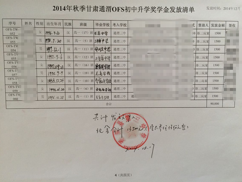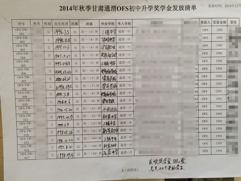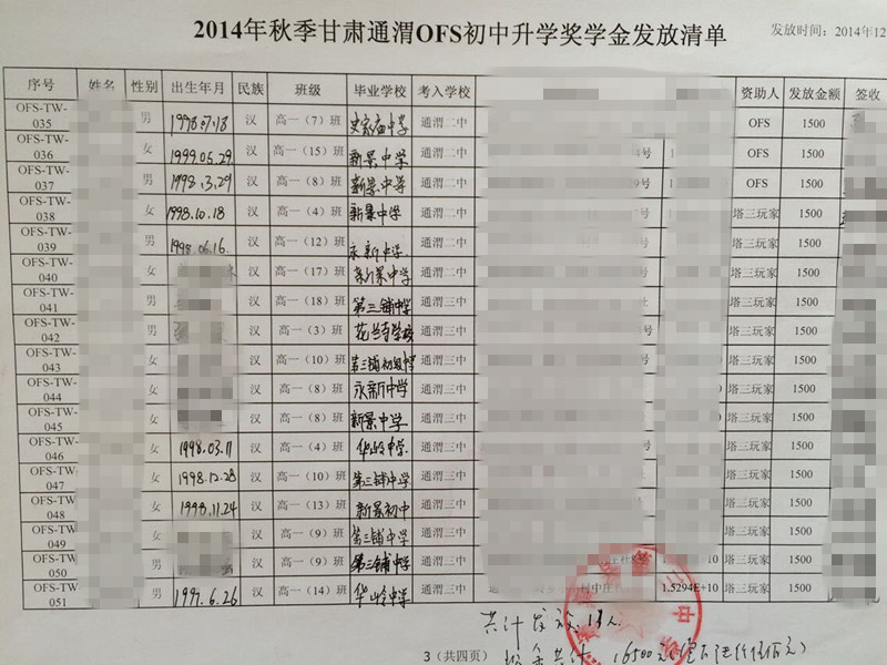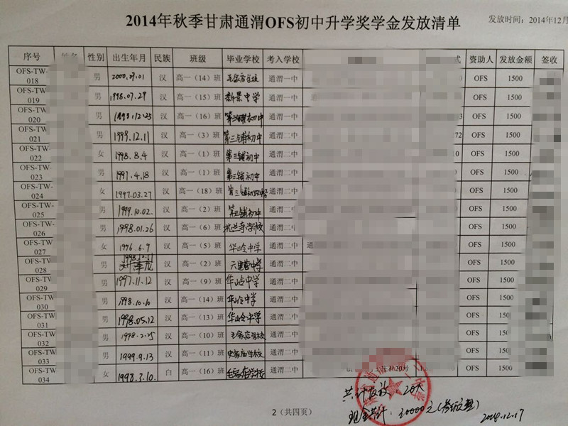 2014年12月甘肃省通渭县高中生奖学金发放公示