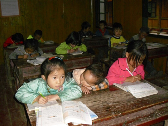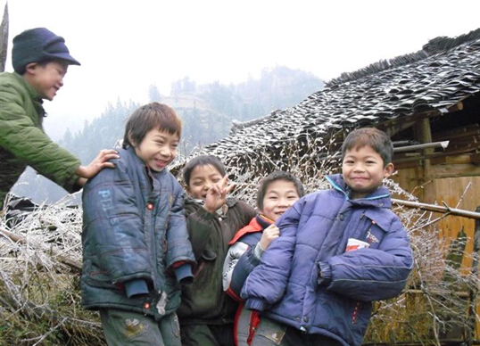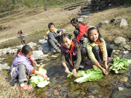 [7_56\G4 2009年的时候时金坑交通很不方便,所以我们平时吃菜基本上都是学生送的白菜,水灵灵的,用溪水洗的干干净净。有时也会送红薯和南瓜,好吃得很。孩子们也敏感,怕你过意不去,总爱说:”老师英语( 当地侗语是倒装,所以孩子们总是把“英语”放在“老师”后面),不用谢,我们的红薯和南瓜都是喂猪的。“ 村里有办酒席的,有的孩子们会把分给他们唯一的鸡蛋拿给我吃,有的团个糯米团子,用脏兮兮的小手递到我的嘴里,每次吃下去都没拉肚子。