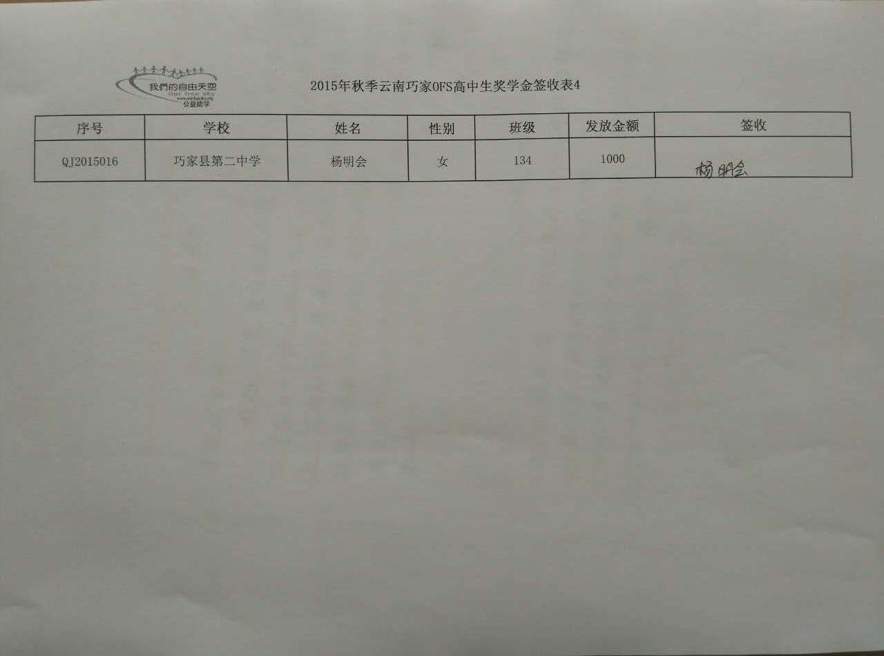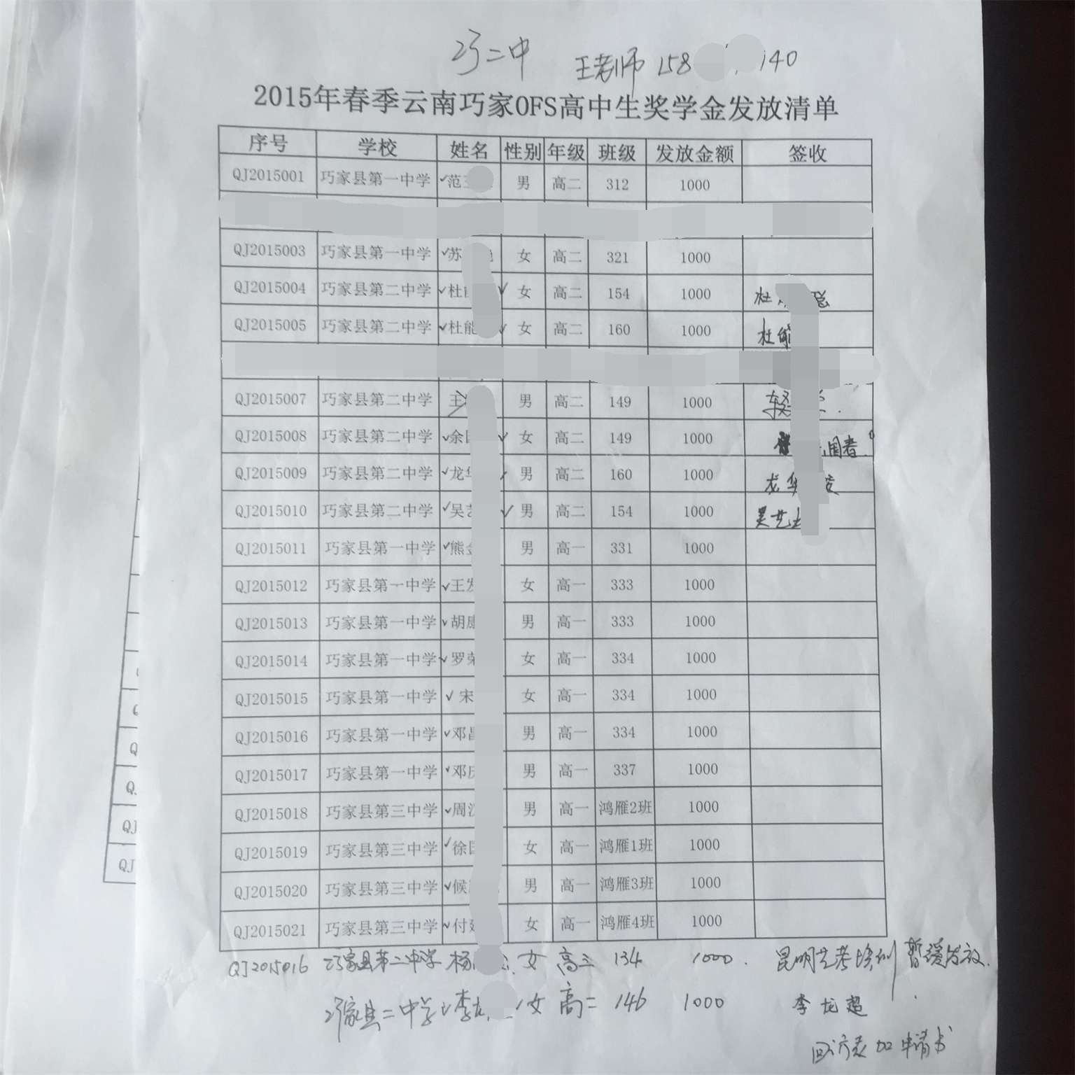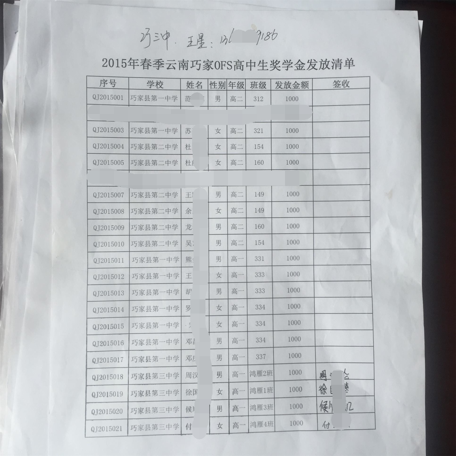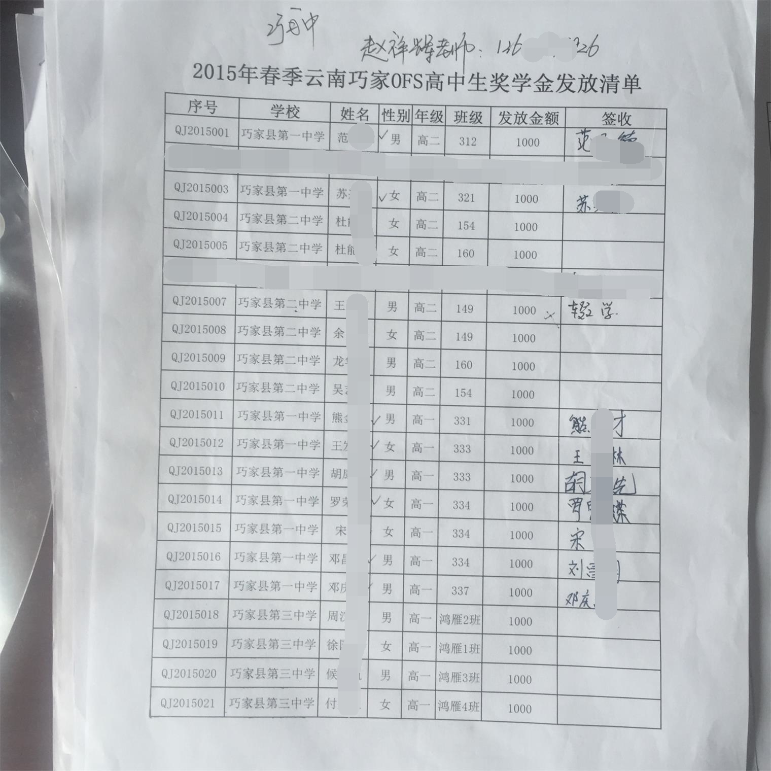 OFS走访志愿者在2015年9月14日--2015年9月18日对云南省昭通市巧家县助学点进行了走访工作,其中重点工作之一就是发放巧家县初升高奖学金,本次奖学金原计划发放奖学金学生20名,因有一名学生当时不在学校需后续补发,走访中实际发放奖学金19名学生,补发1名学生,合计发放金额为20000元,发放明细如下: H-%v3d>3