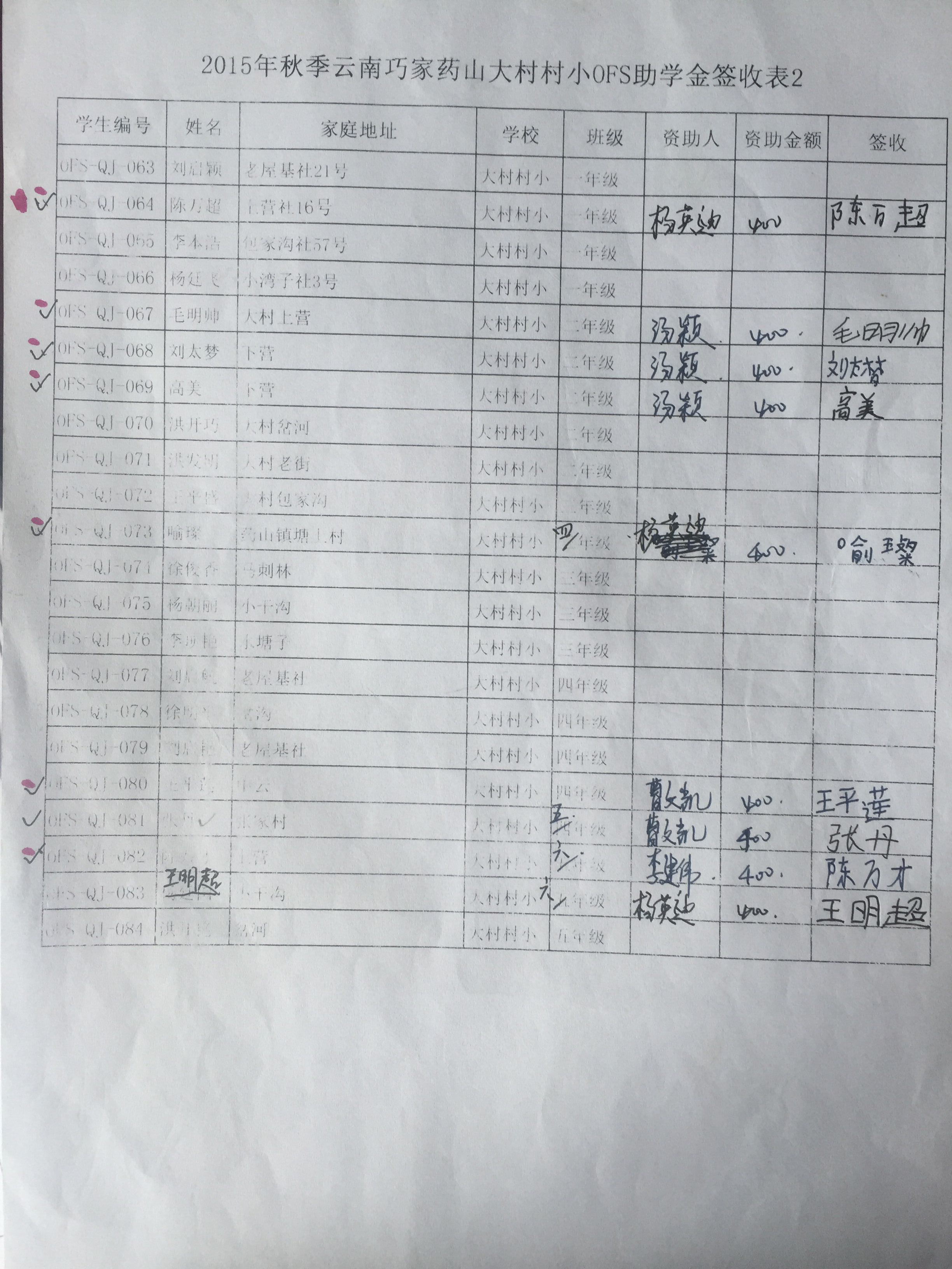 1、大村村小助学款签收表公示如下:(因志愿者分为不同组别同时进行,所以签收表格也是分别签字) DZ:$p.