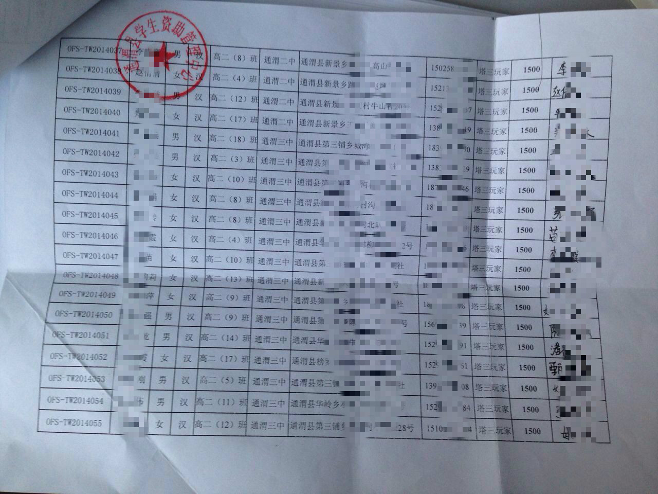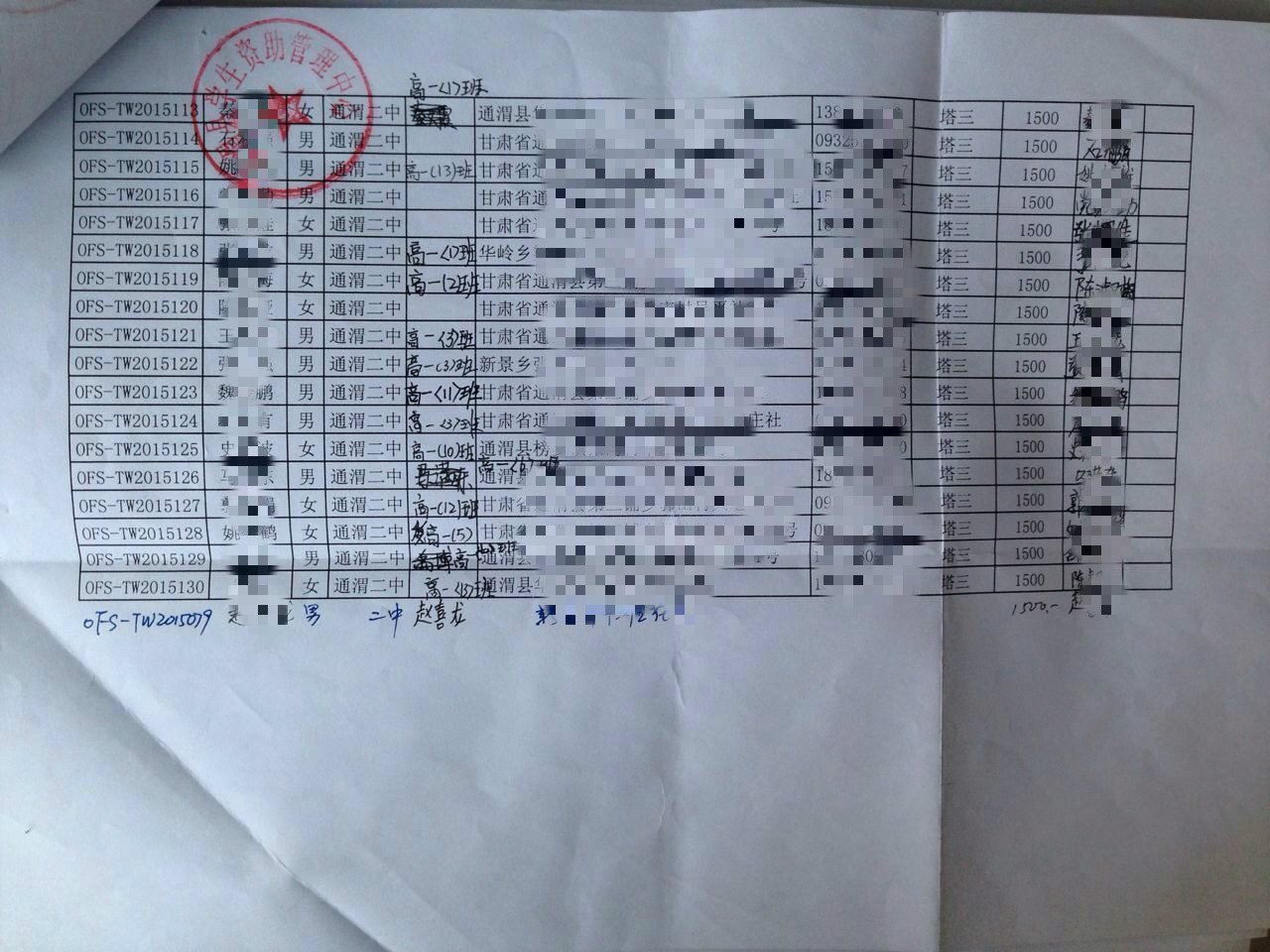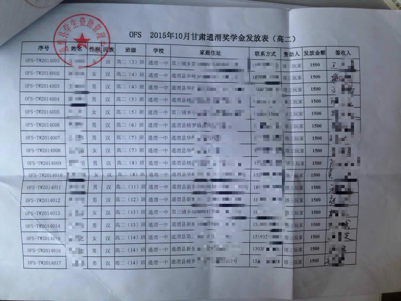 2015年10月甘肃省通渭县高中生奖学金发放公示