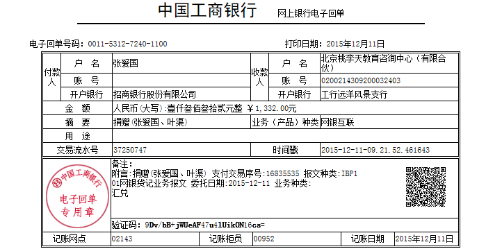 我们的自由天空 公益助学项目组(OFS,桃李天)>Spread The Word· 宣 传 推 广>Summaries· 工 作 汇 总>收到红星美凯龙张爱国先生捐款壹仟叁佰叁拾贰元整 ¥1,332.00元