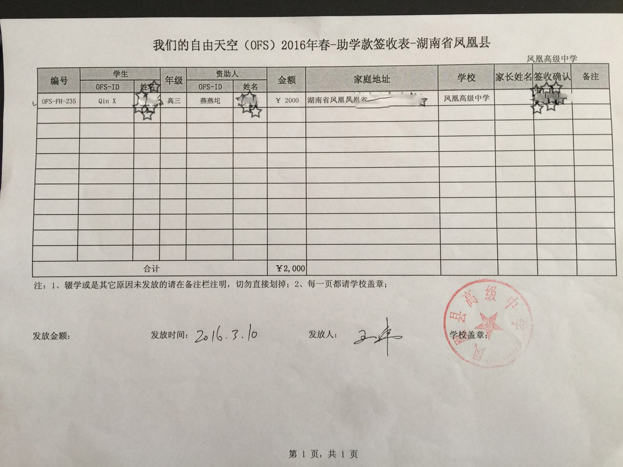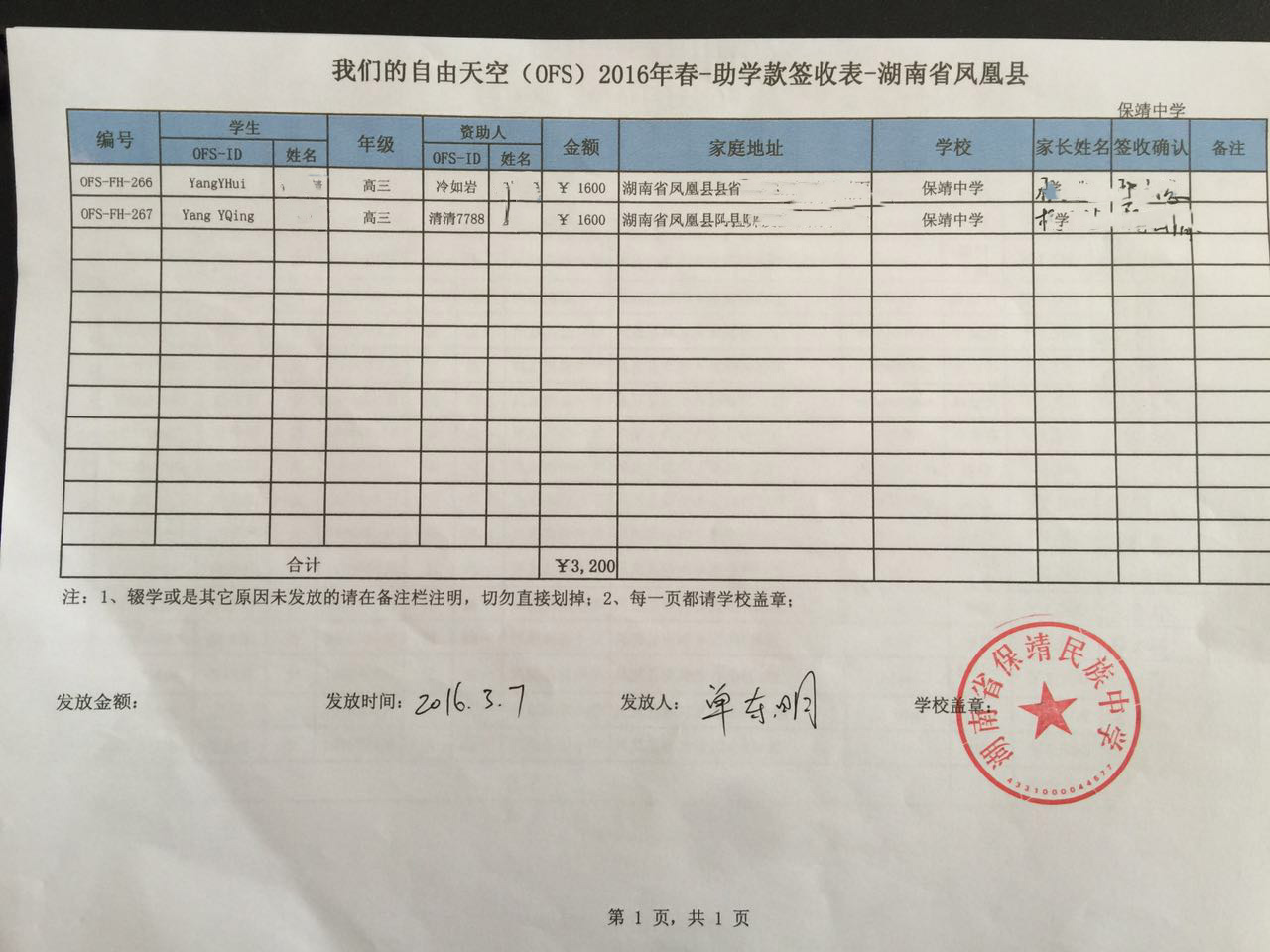 2016年3月9日-3月11日,迎着新年的第一场大雪,三个老炮(队长伟哥这么称呼的)在湖南省凤凰县开启了2016年OFS的第一场走访。本次走访共涉及三所学校,发放三位同学的助学款(共计5200元),发放十五位同学的奖学金(共计24000元),合计29200元整;除了发放这些孩子的奖学金和助学款外,这三个老炮还肩负着更重要的使命,那就是完成20多个新增的助学款孩子的家访,以及麻冲九年制学校推荐的15个高中奖学金候选孩子的家访;走访结束,三个老炮倒下了两个,在此再对他们说一声辛苦了,感谢他们在百忙之中抽出时间来完成这一次走访工作。