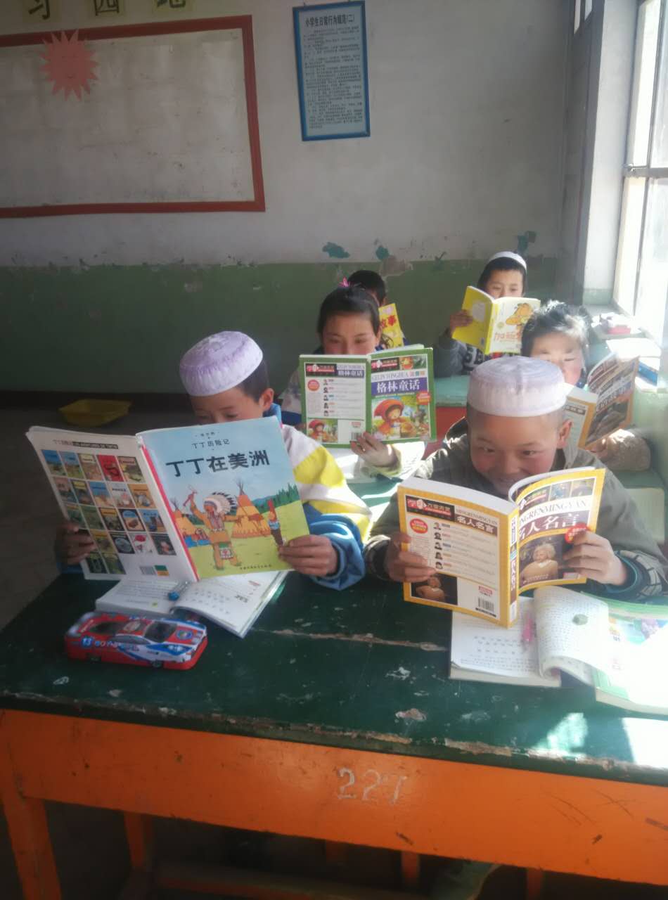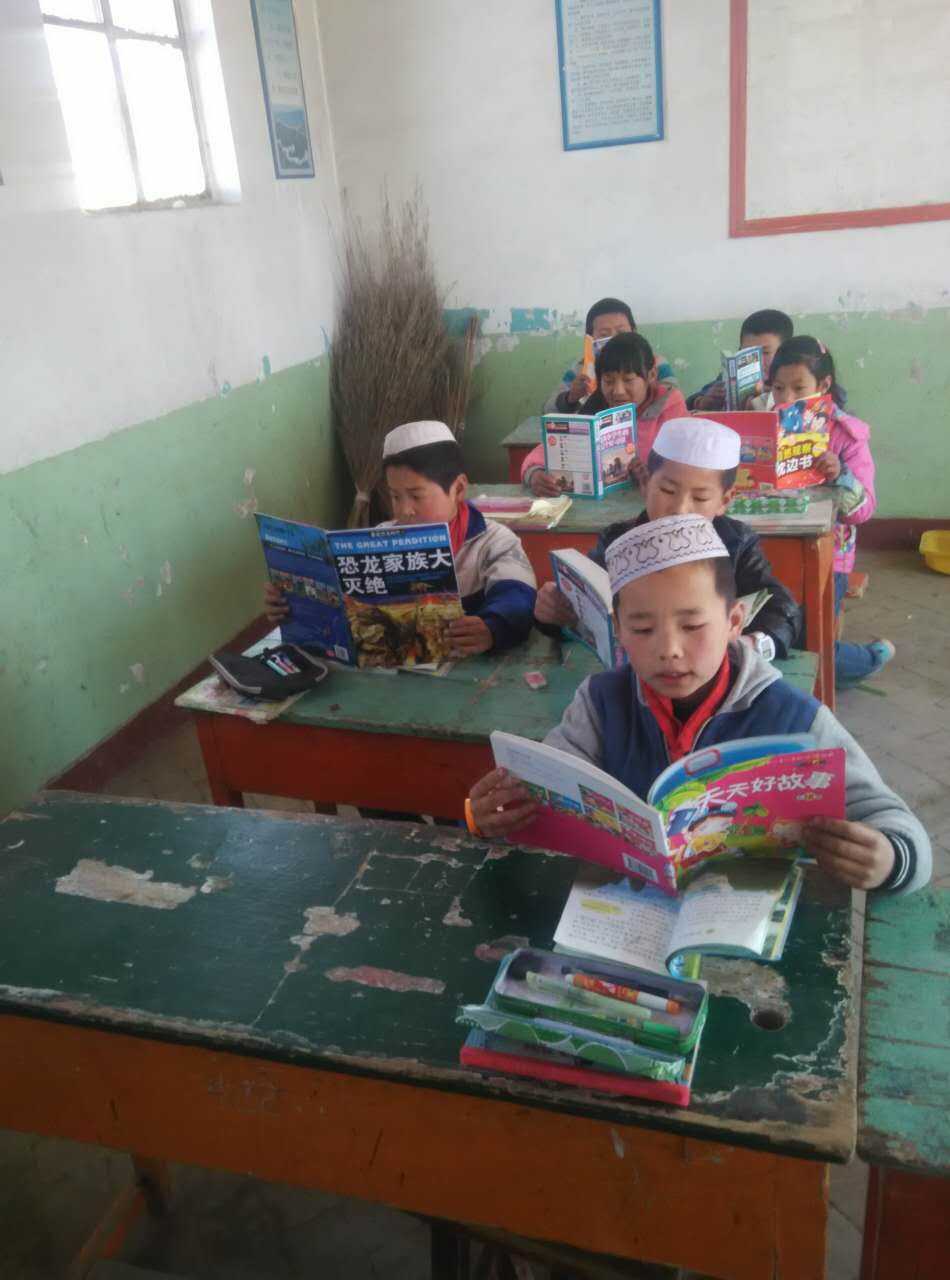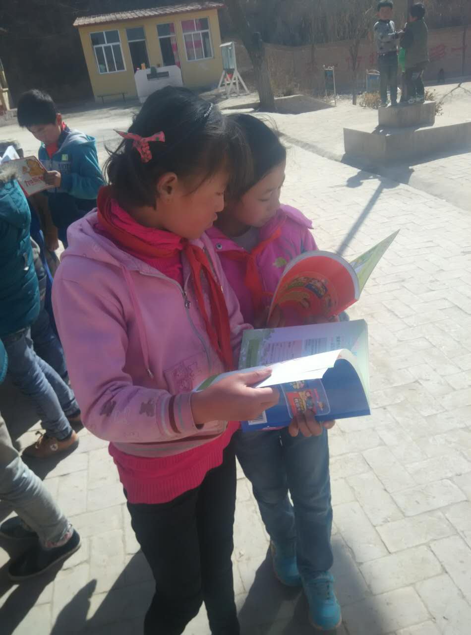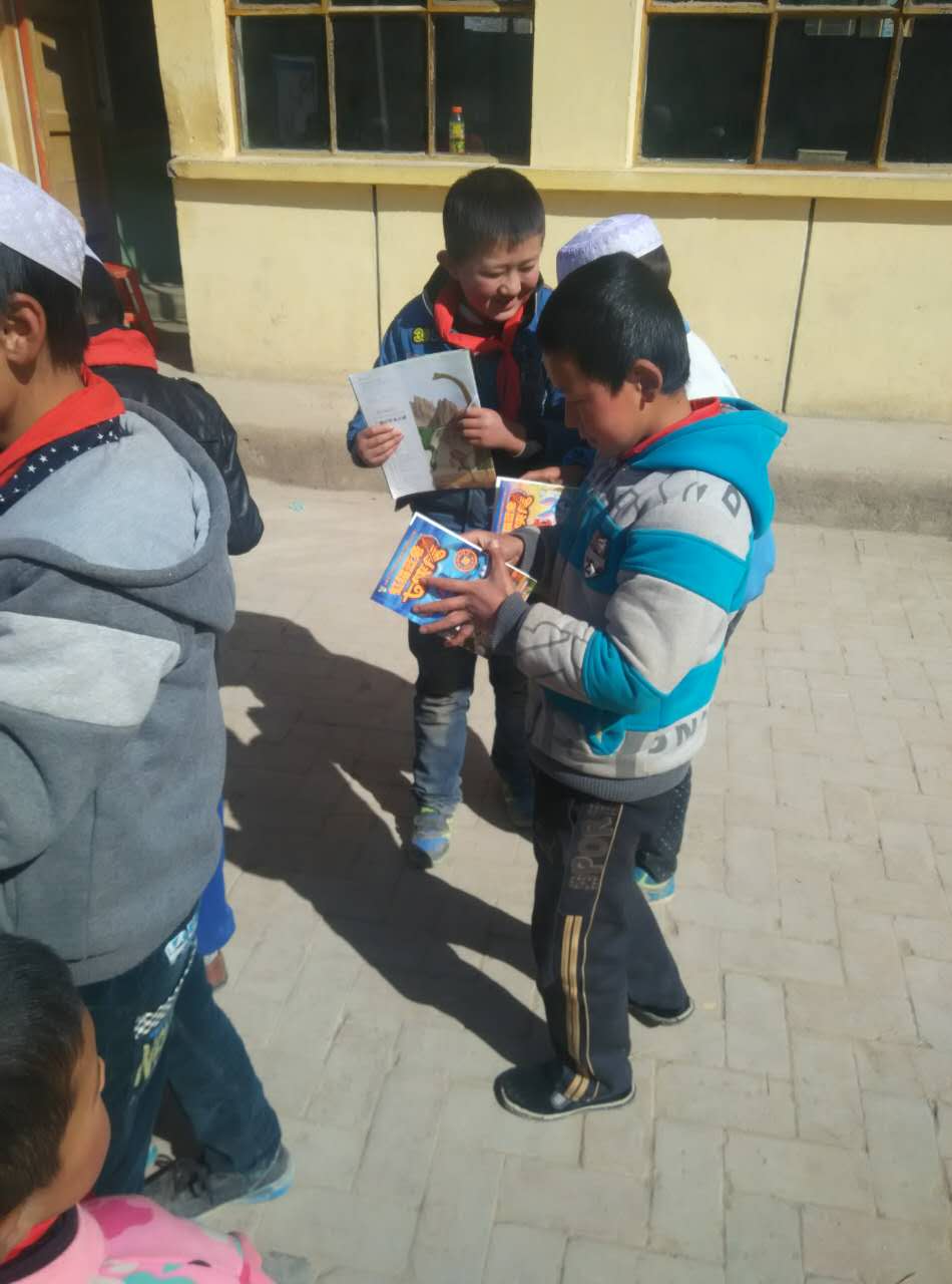 2016年3月开学。班里一个孩子的爸爸又给班级送来了新书。原有的图书都他们“啃食”过了。“把它们送给甘肃的低年级同学吧”史老师和同学们的想法不谋而合。于是一个来自首都的沉甸甸的爱心书箱跨越4个省、十几个城市辗转来到甘肃的孩子中间。像拿着长袜的孩子等到了圣诞老人一样。临夏的孩子们欢呼着、跳跃着、迫不及待的把书摆在乒乓球台上,争先恐后的挑选自己喜欢的书,甚至有点纠结一时不知选哪一本更好!恨不得多长出几双眼睛一口气能看完所有的书。