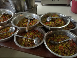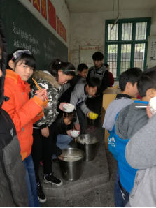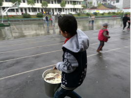 恰逢中午开饭时间,各班派代表领取饭食回班级分发,国家的午餐补贴政策基本落到了实处,食物虽然简单,卫生条件一般,但至少保证了孩子们可以吃饱饭上学。据说一些孩子就是为了有这样的午餐才坚持上学的。(排队领餐的孩子们)