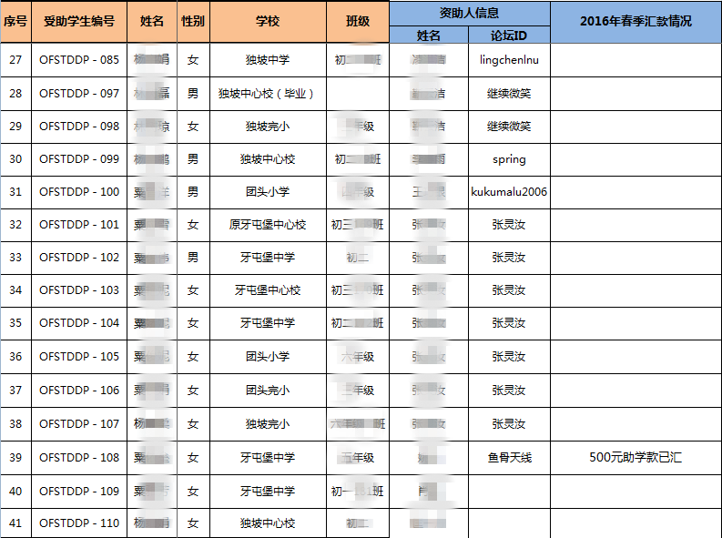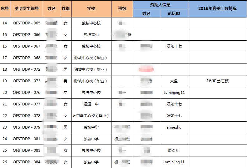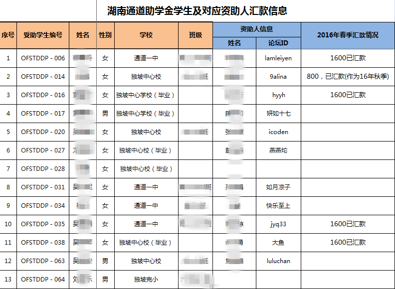 [公 示]2016年春季湖南通道助学金汇款公示 [复制链接]