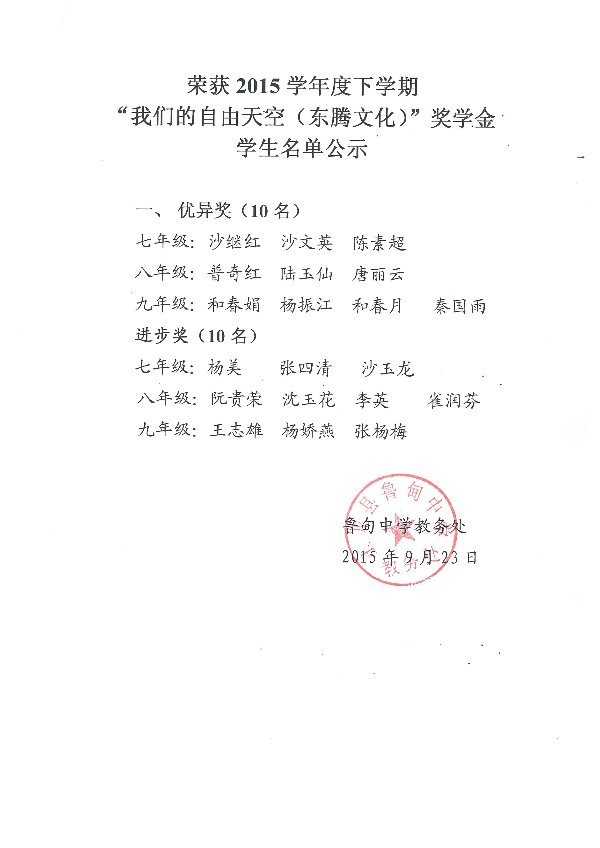 [公 示]2015学年下学期”我们的自由天空(东腾文化)“奖学金发放公示 [复制链接]
