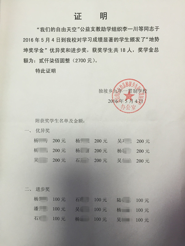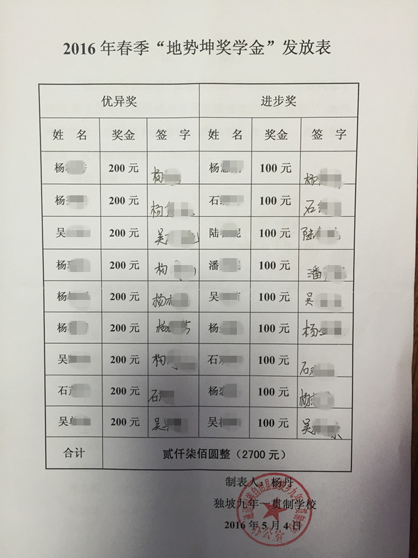 2016年春季湖南通道地势坤奖学金,共有18名学生获得,其中优异奖9名,每人200元;进步奖9名,每人100元,总计2,700元。