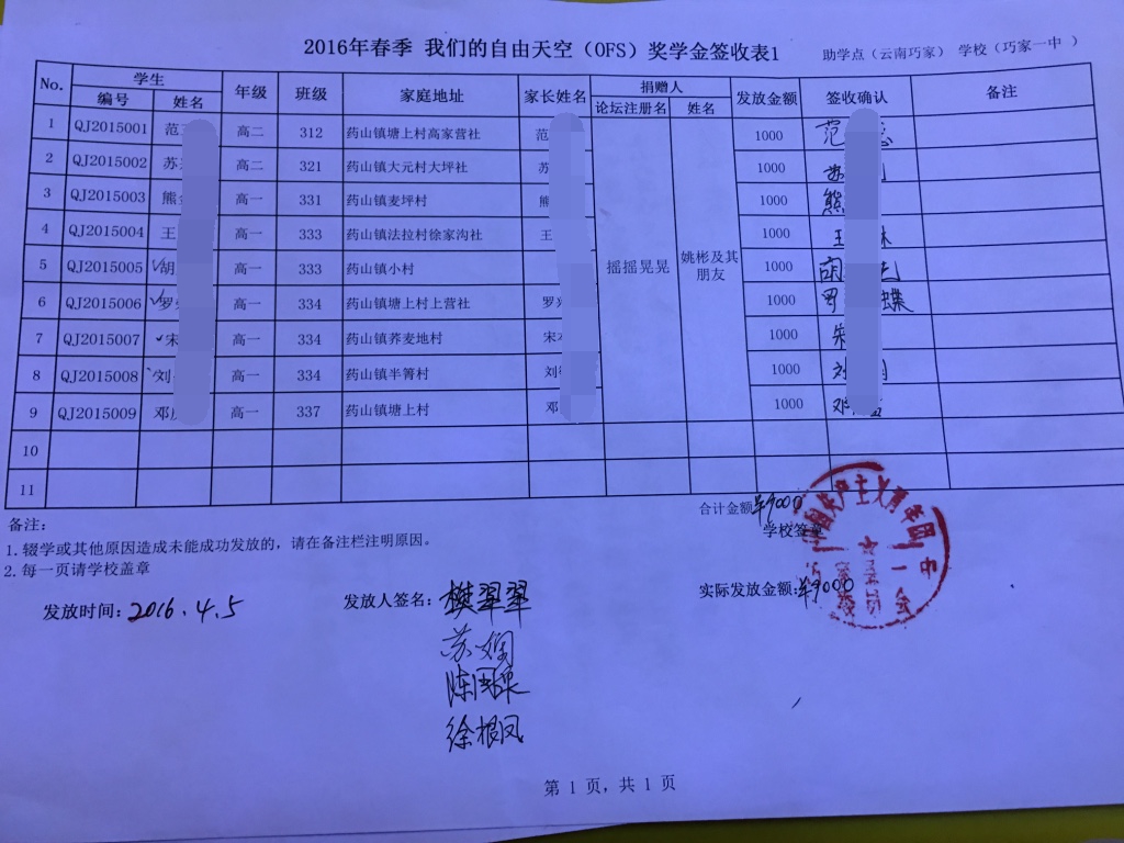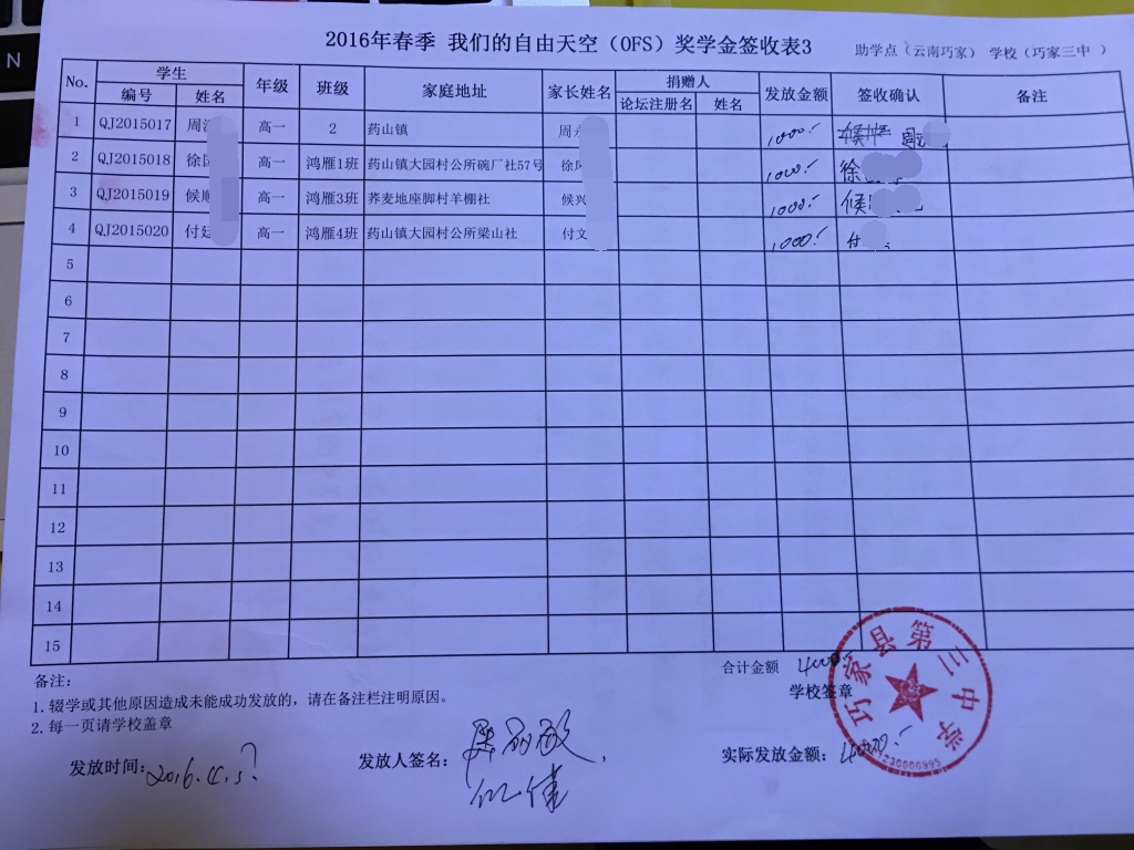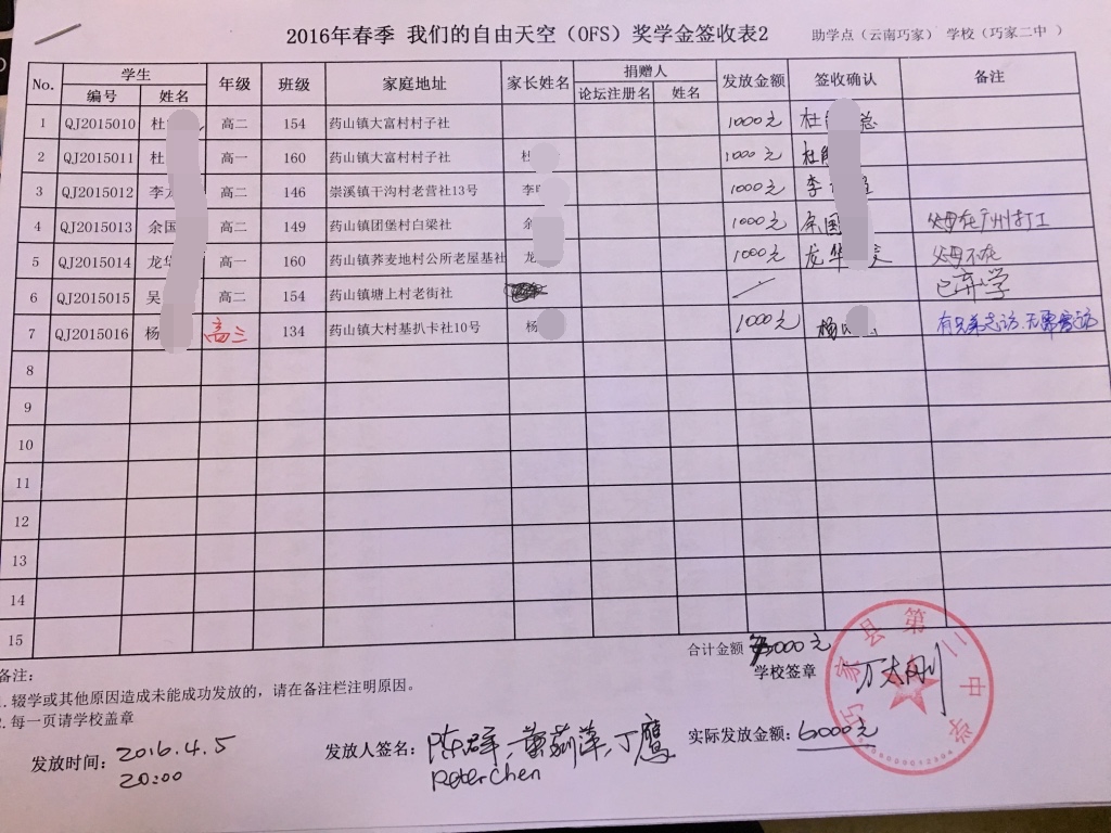 OFS走访志愿者在2016年4月6日--2016年4月8日对云南省昭通市巧家县助学点进行了走访工作,其中重点工作之一就是发放巧家县初升高奖学金,本次奖学金原计划发放奖学金学生20名,其中一名学生遗憾辍学,实际发放奖学金19名学生,合计发放金额19000元,发放明细如下: '/gwC7*-&