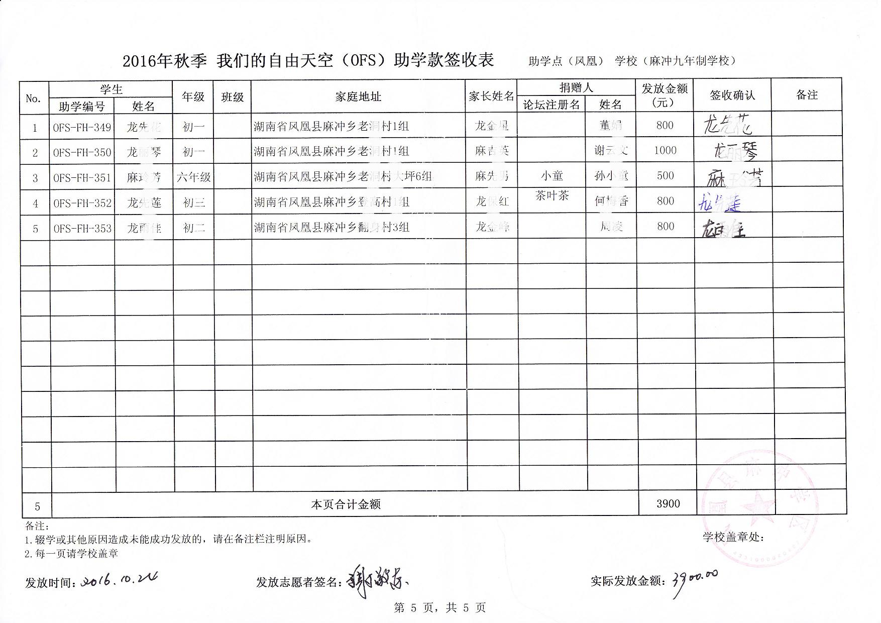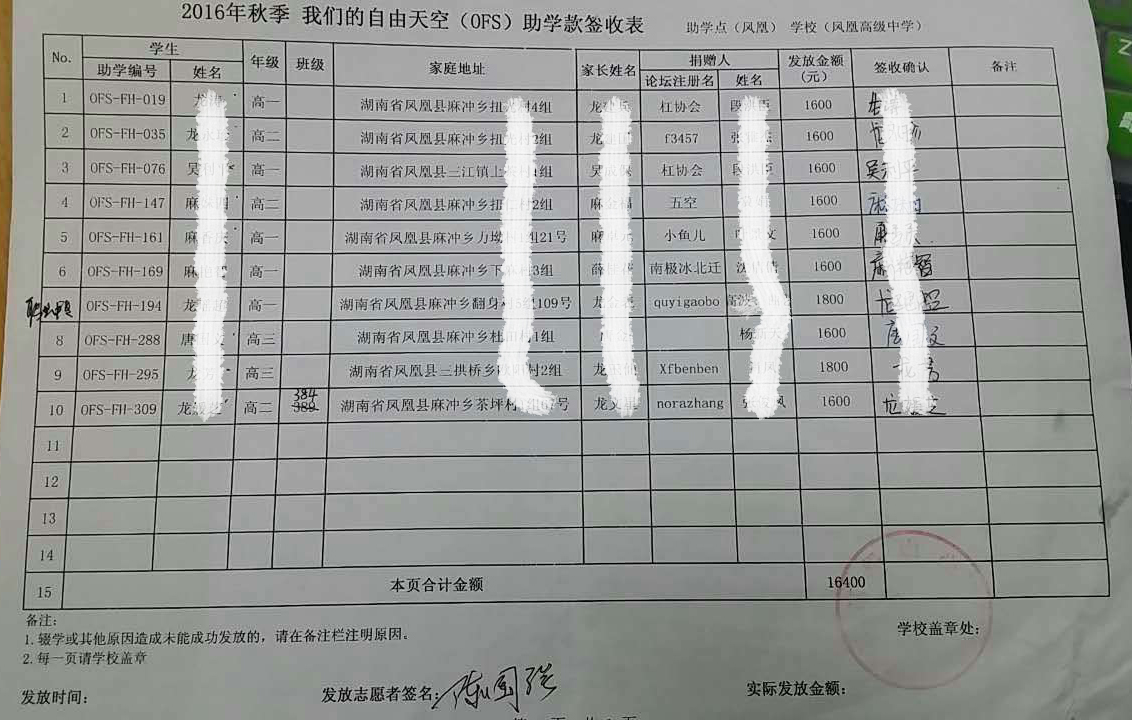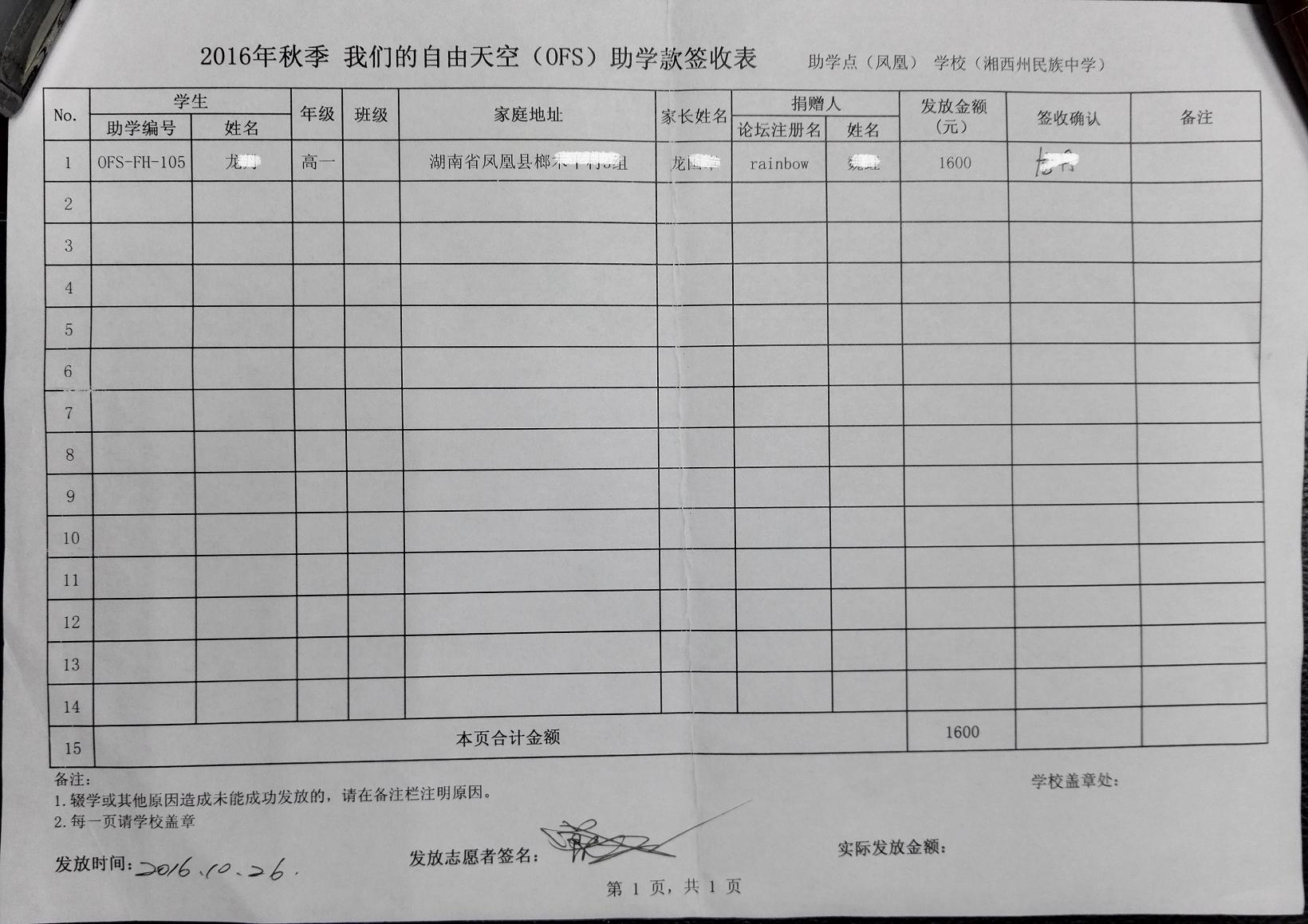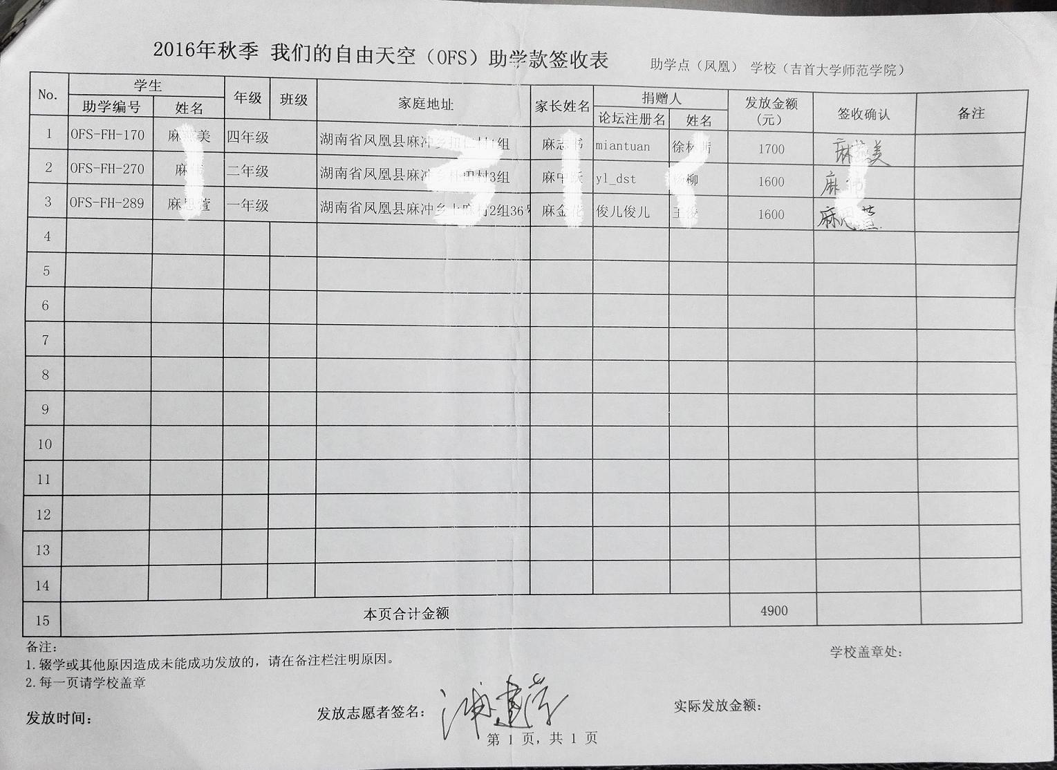 2016年10月24-28日,经过OFS走访志愿者楚寒、韩姐、万水、阳光、ATzou、大玲走访(长沙、益阳分别由志愿者丁老师和远方发放),在湖南凤凰共发放奖学金37900元,助学金87800元。为保护孩子及资助人的权益,我们将孩子及资助人的真名在公示中隐去,原版文件将在反馈2016年秋季信息时发到资助人邮箱,如有疑问可发送邮件到:fenghuang@ourfreesky.org。现将签收表公示如下:
