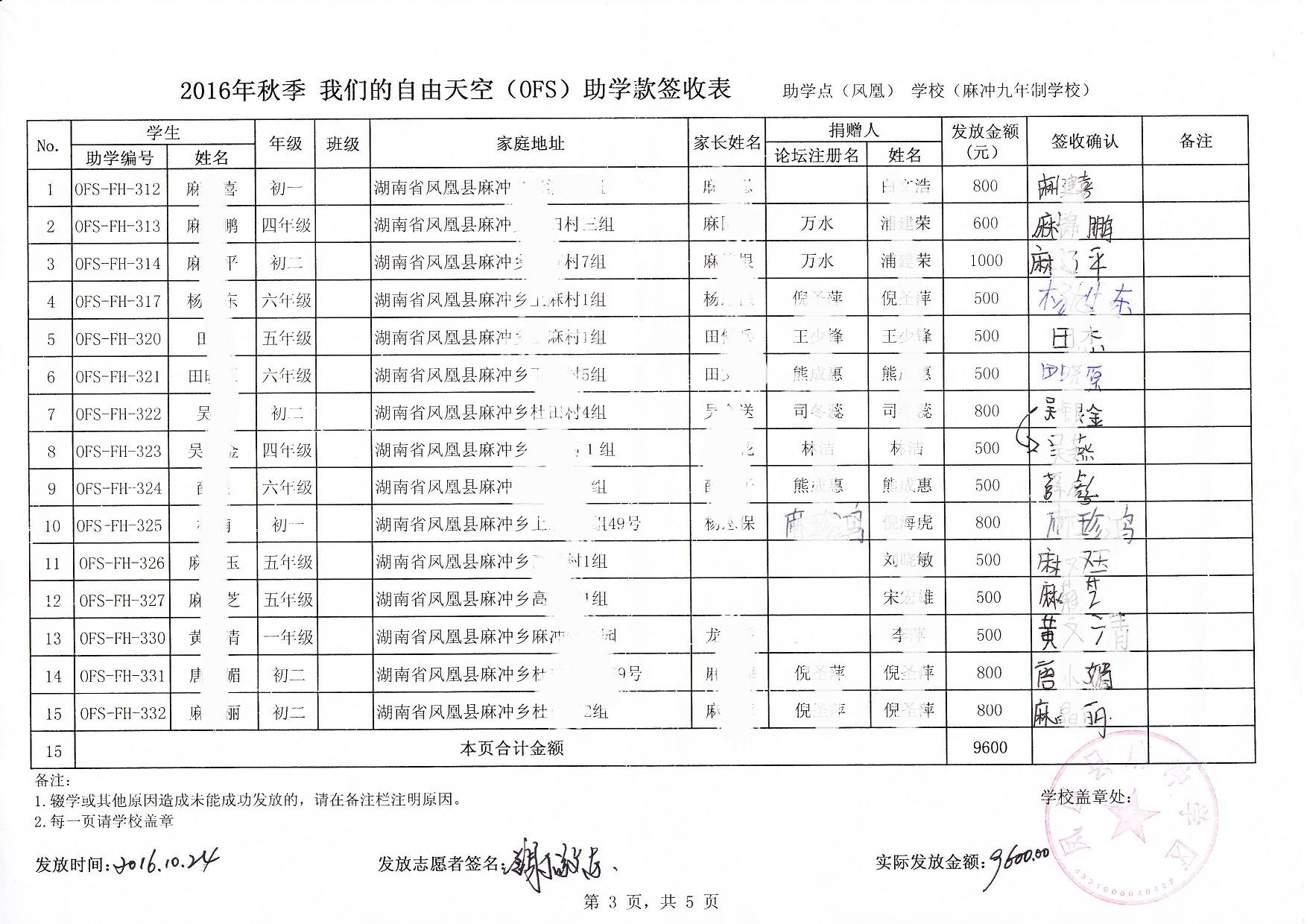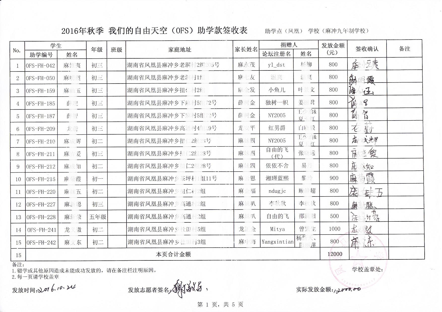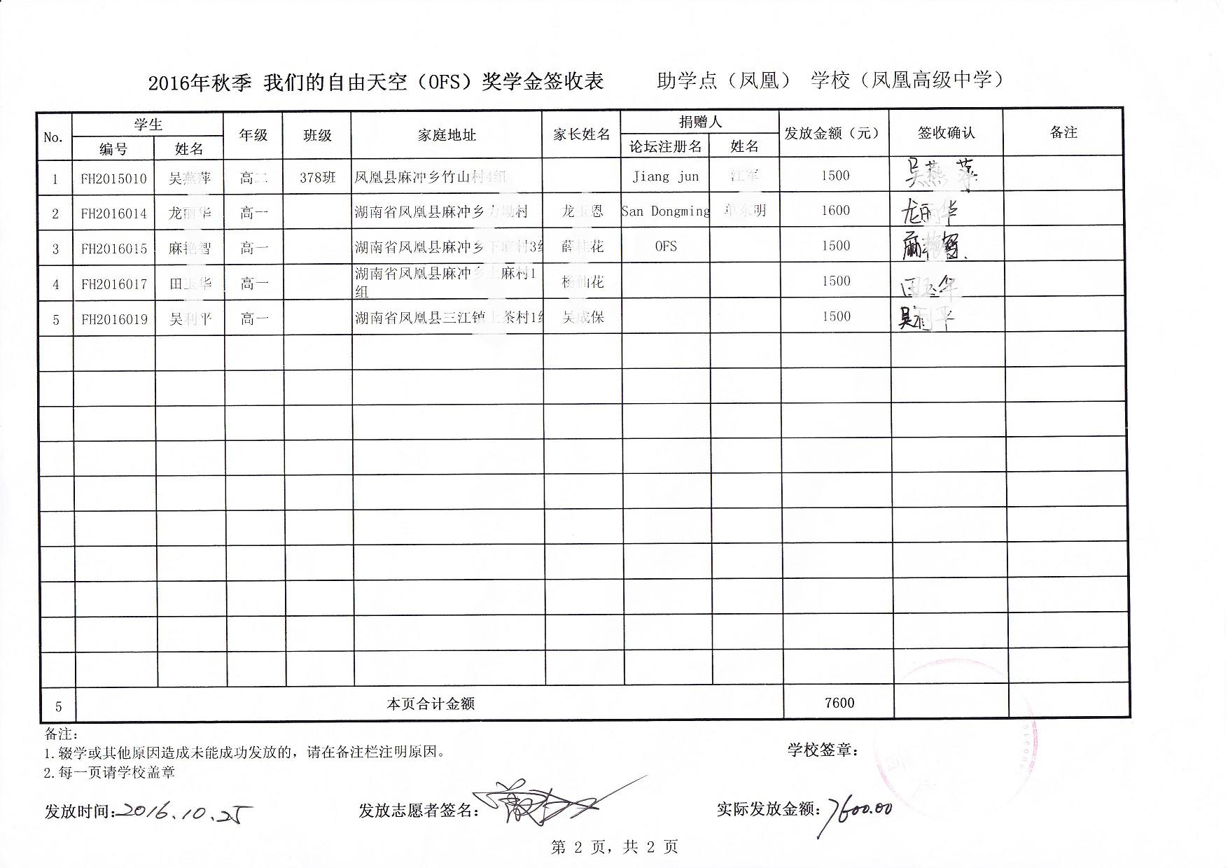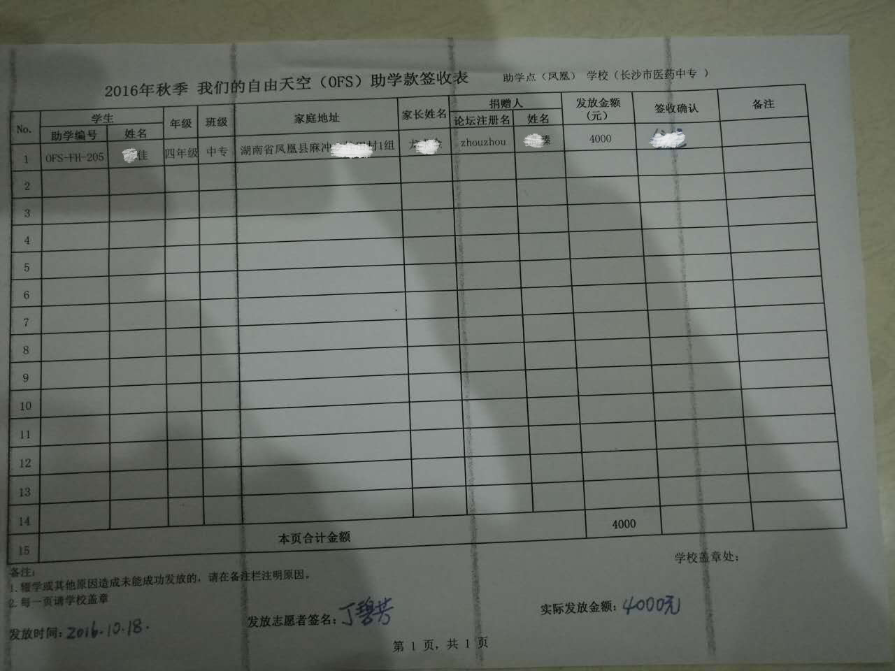 2016年10月24-28日,经过OFS走访志愿者楚寒、韩姐、万水、阳光、ATzou、大玲走访(长沙、益阳分别由志愿者丁老师和远方发放),在湖南凤凰共发放奖学金37900元,助学金87800元。为保护孩子及资助人的权益,我们将孩子及资助人的真名在公示中隐去,原版文件将在反馈2016年秋季信息时发到资助人邮箱,如有疑问可发送邮件到:fenghuang@ourfreesky.org。现将签收表公示如下: