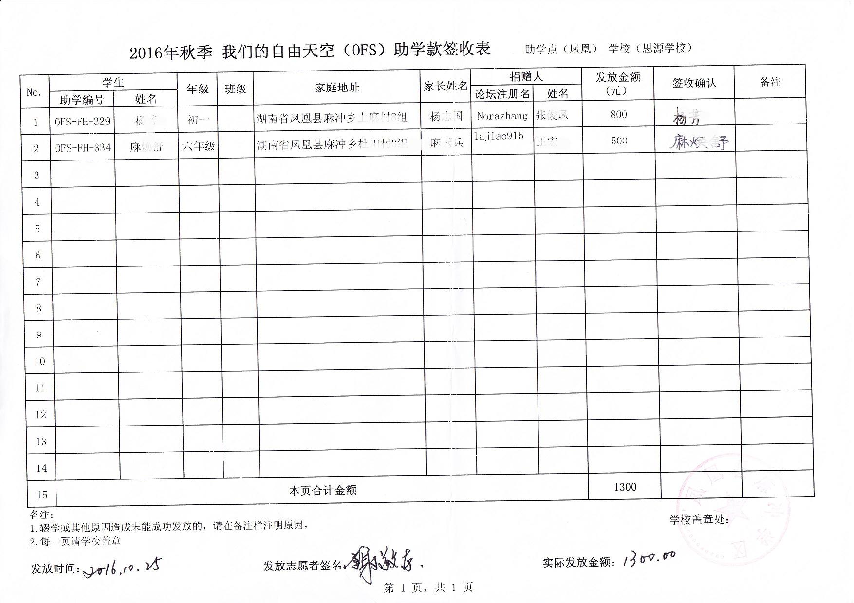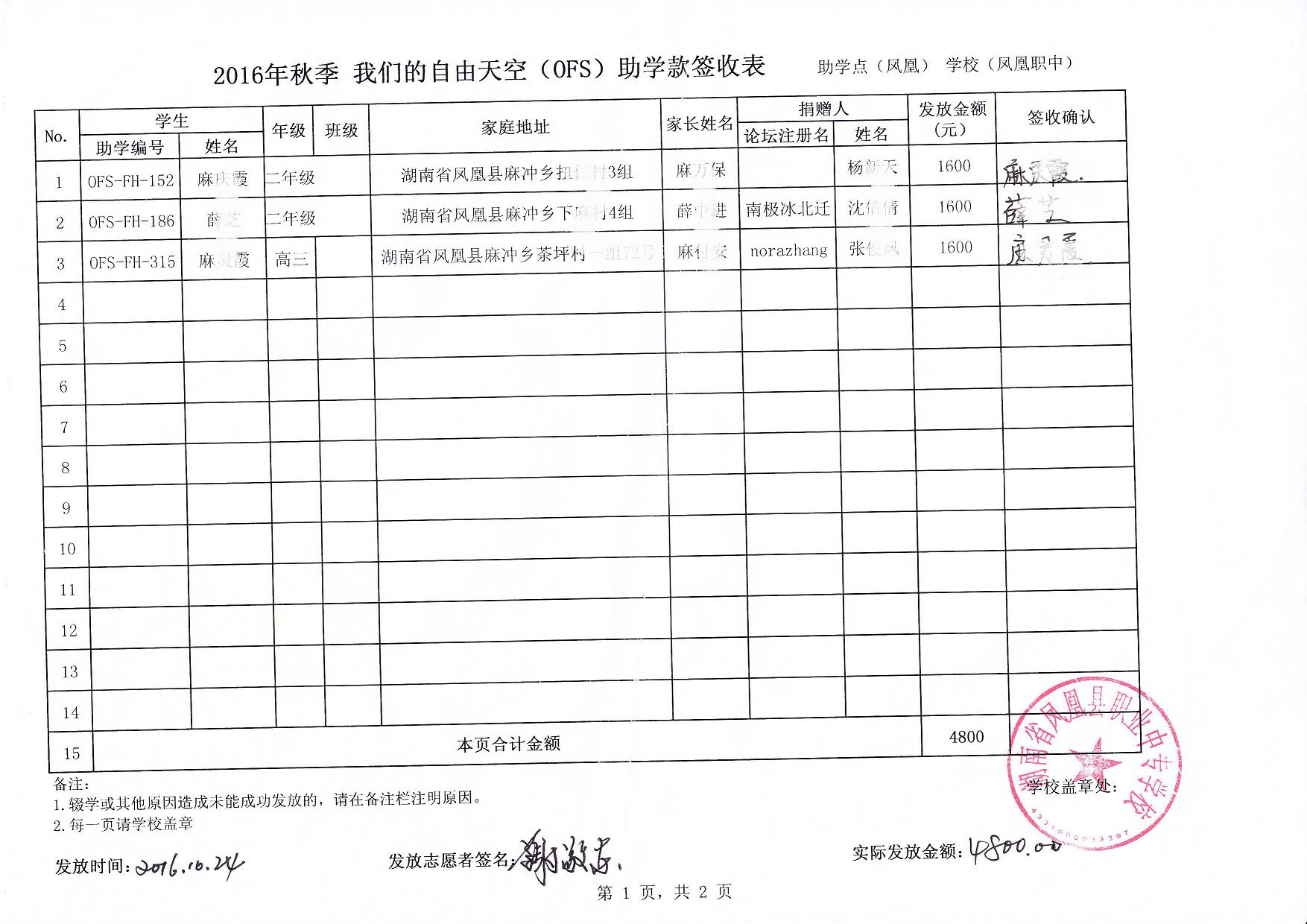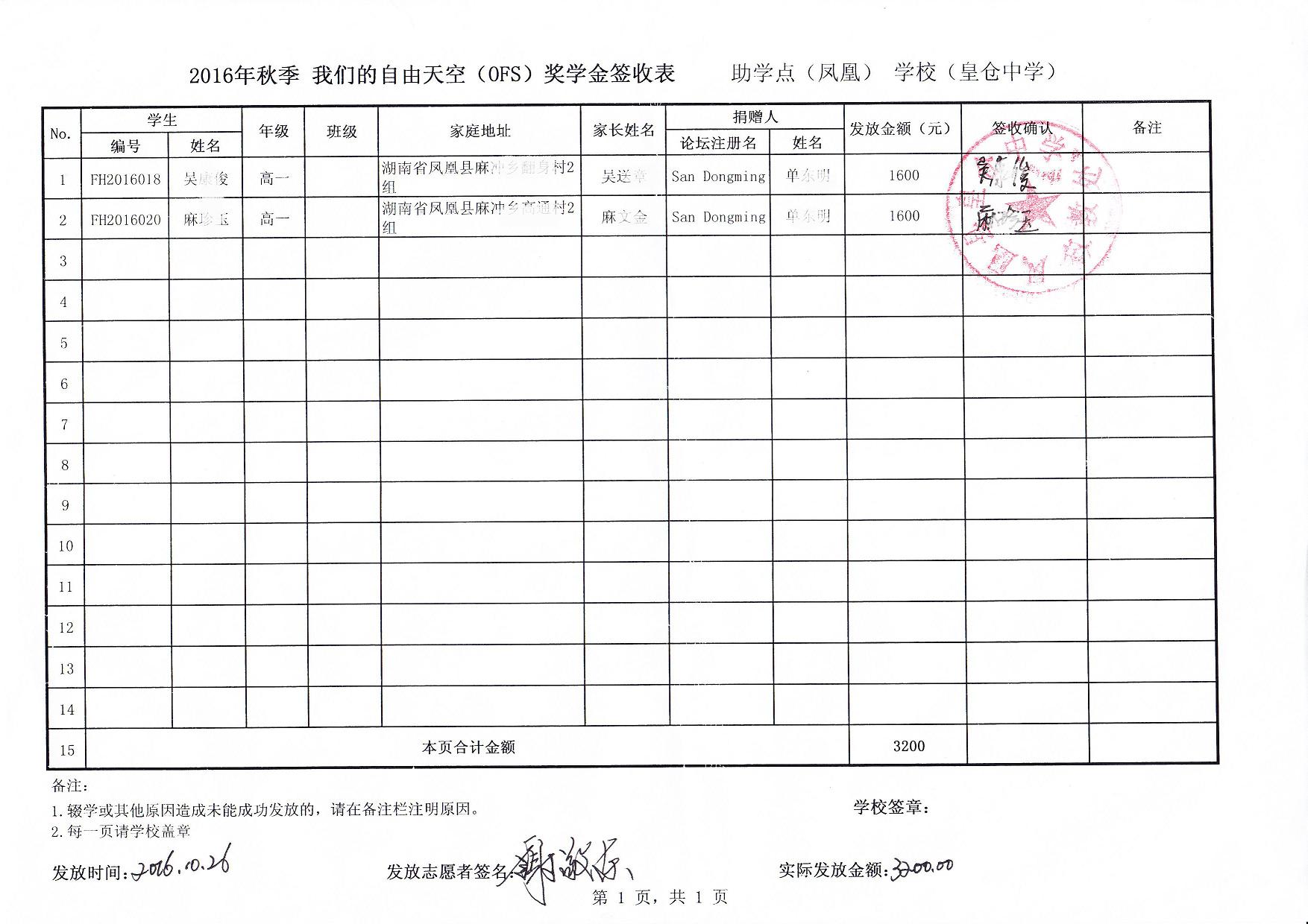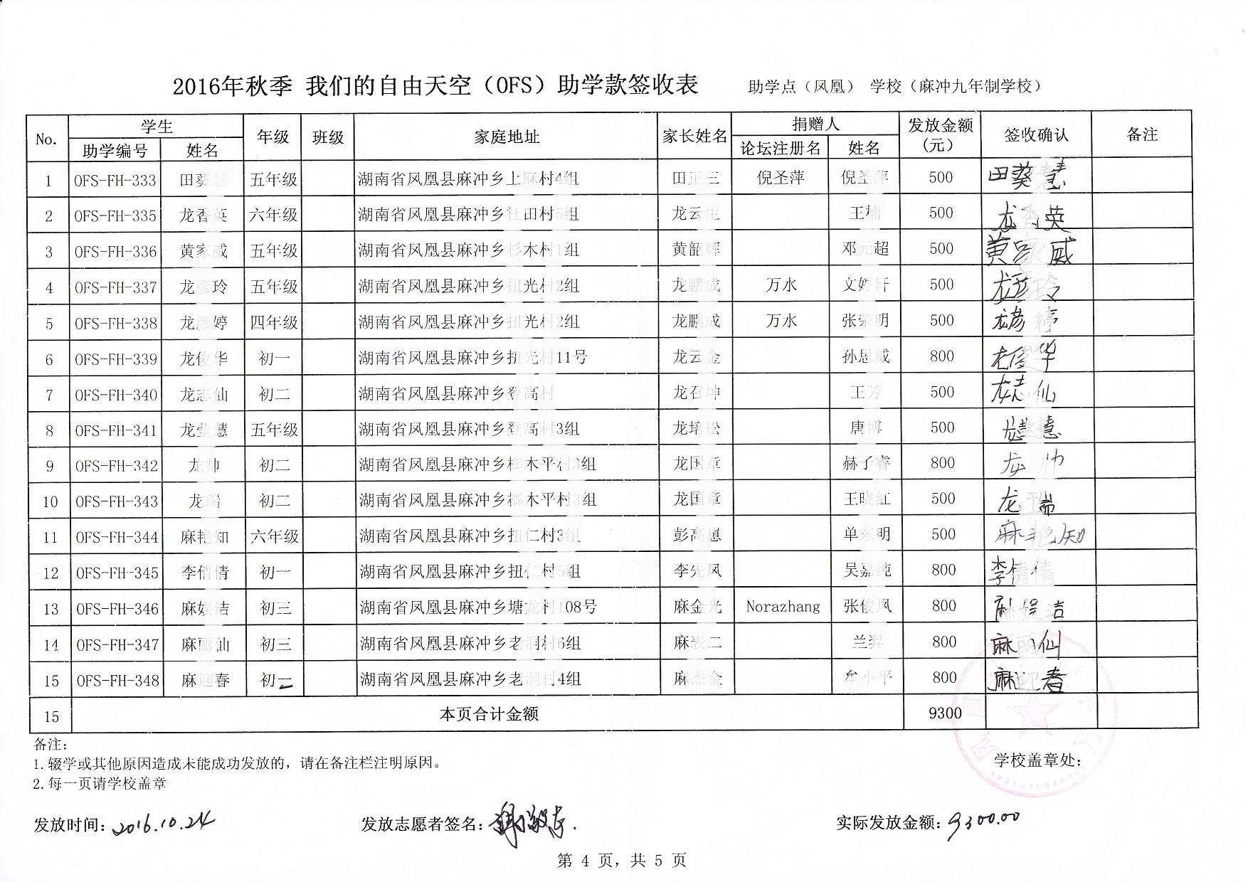2016年10月24-28日,经过OFS走访志愿者楚寒、韩姐、万水、阳光、ATzou、大玲走访(长沙、益阳分别由志愿者丁老师和远方发放),在湖南凤凰共发放奖学金37900元,助学金87800元。为保护孩子及资助人的权益,我们将孩子及资助人的真名在公示中隐去,原版文件将在反馈2016年秋季信息时发到资助人邮箱,如有疑问可发送邮件到:fenghuang@ourfreesky.org。现将签收表公示如下: