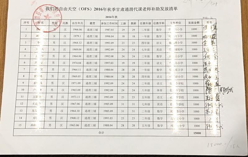 谁来挽留代课老师是OFS发起的一项为乡村代课老师发放补助的项目。众所周知,在广大的乡村还有很多长期坚守在一线的代课老师引导着孩子们的学习和生活,但这些代课老师大多数收入都较低,而且也没有其他的保障,这是导致代课老师缺失的一个很重要的原因。为了能让更多的代课老师安心教学,OFS特发起此项目,这个项目在发起以后得到了很多人的支持,在2015年春季时,OFS已经在湖南通道为20位代课老师进行了发放;2016年秋季,OFS来到了甘肃,为甘肃通渭的15位长期坚守在教学第一线的代课老师进行了补助发放,公示如下: