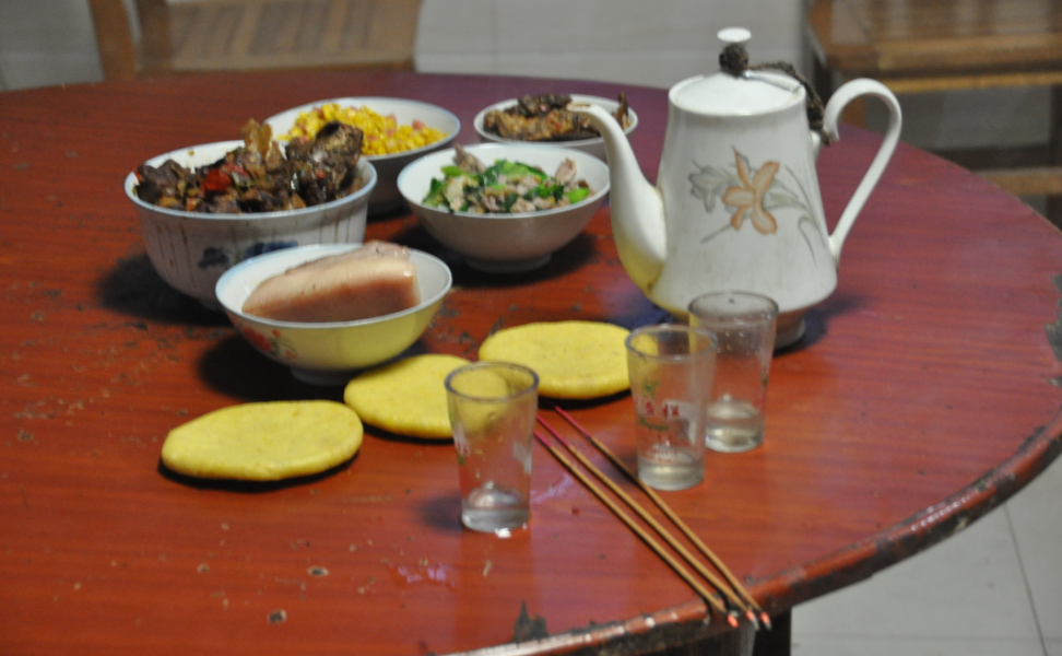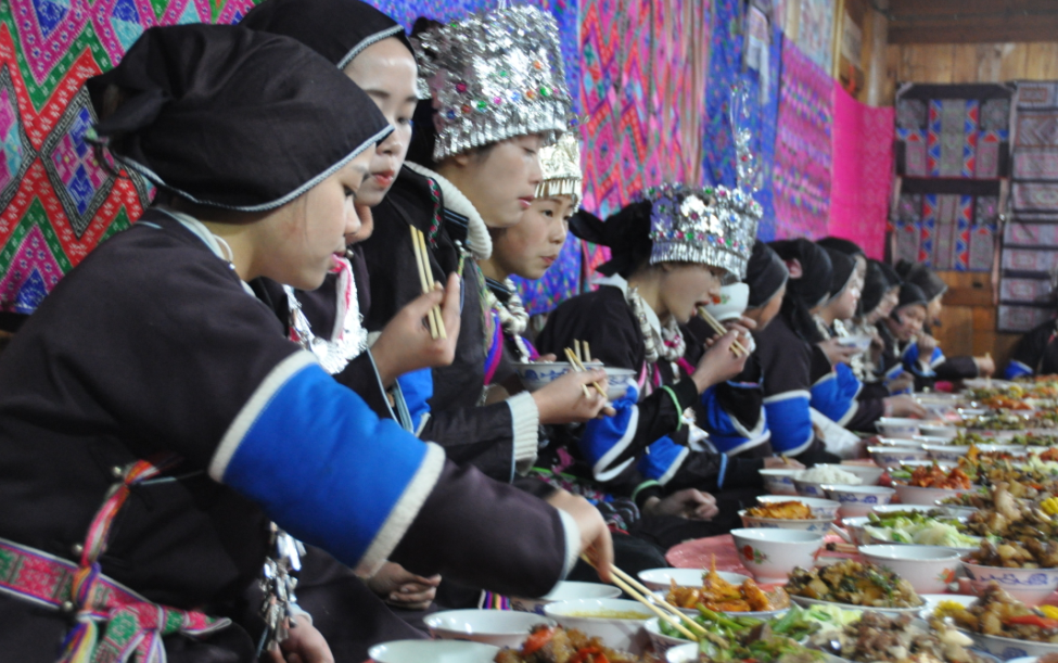客寨的"耶龙"三人一伙、五人一群被"抢"到主寨各家 各户以后,没有"抢"到客的人家,在"抢"客时"抢"不到 客,已心感内疚,总得想点办法尽地主之谊。于是,就将自家的 酸鱼、酸肉、酸鸭子之类的佳肴用碗盛着,外加一壶米酒,用篮 子拎到"抢"到客的人家去"陪耶"。"陪耶"还为主寨的后生 创造了认识客寨姑娘的条件,哪家"抢"到"耶龙"姑娘,后 生就把自家最好吃的东西往那家拎。因此,主寨招待"耶龙" 的建席十分丰富多彩。酸鱼、酸肉、酸鸭,还有其他的美味佳肴 摆满了娃席。主人将米酒筛好后,酒宴在热烈的气氛中开始。