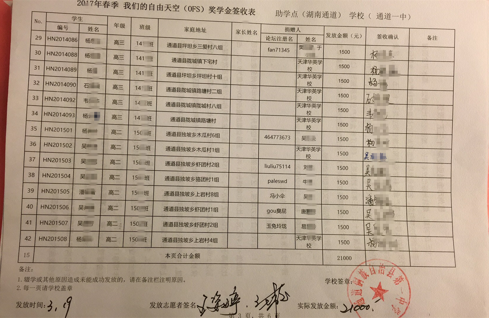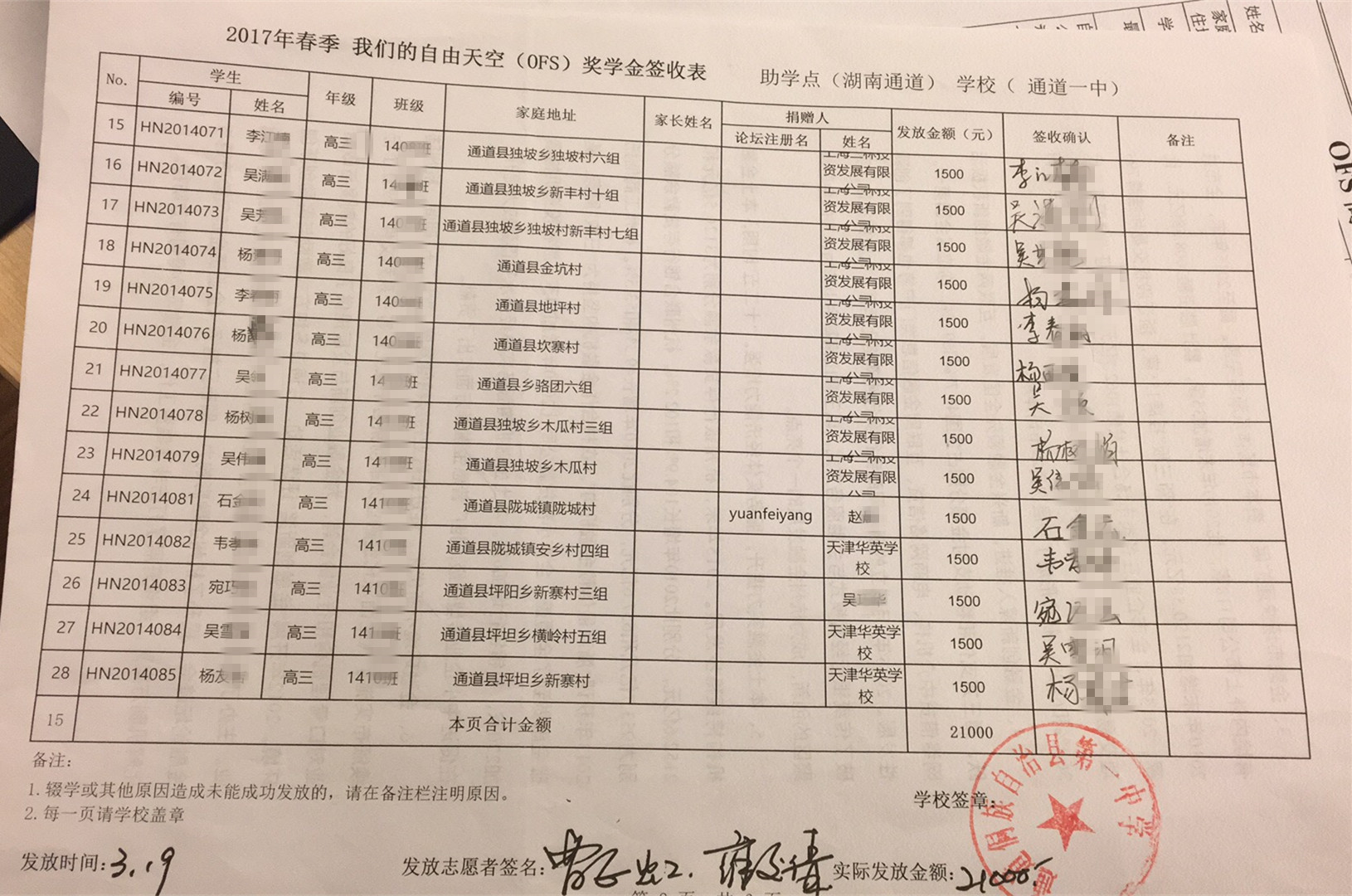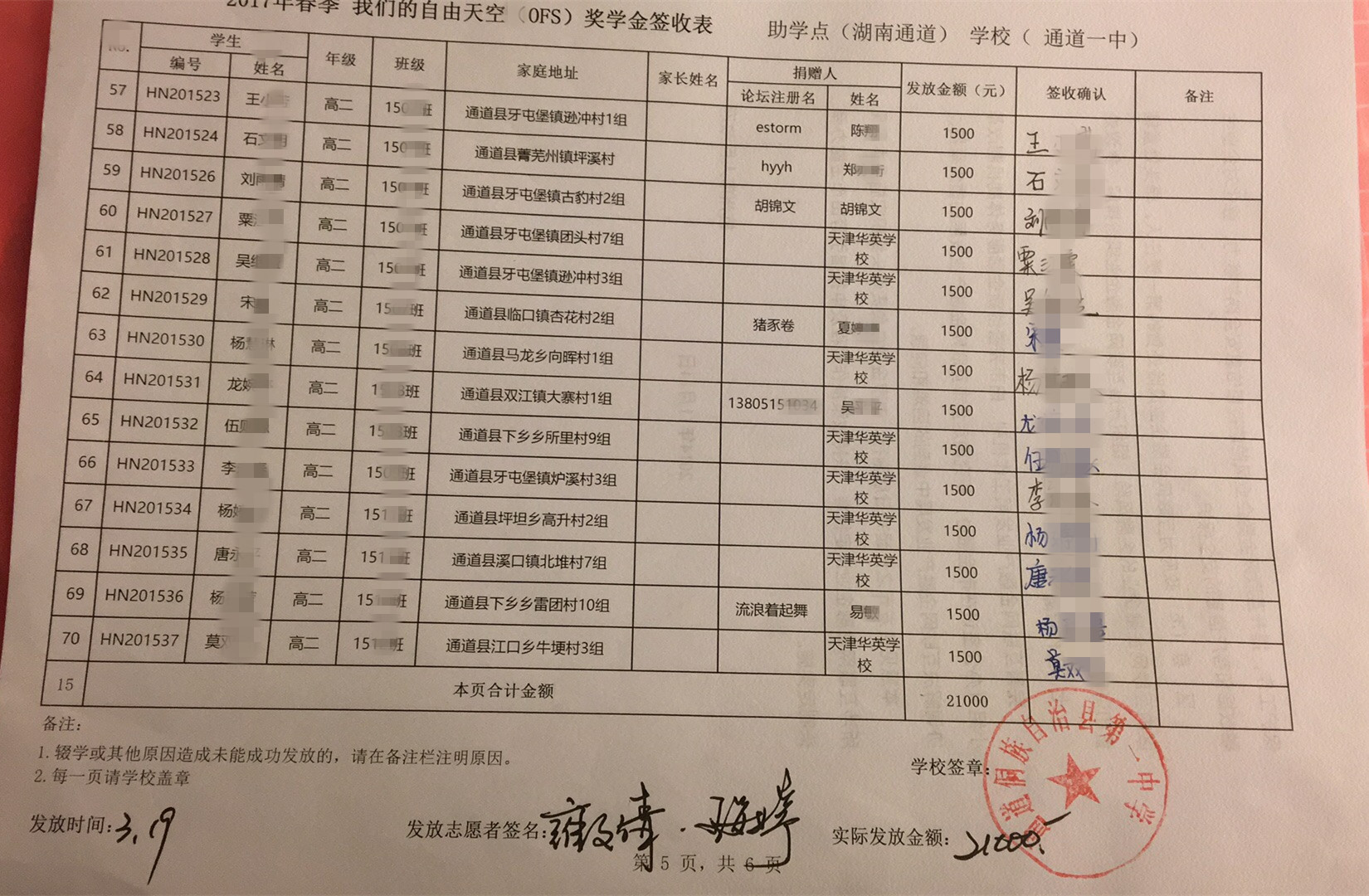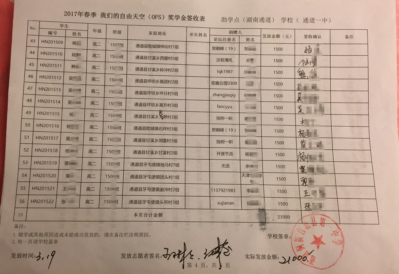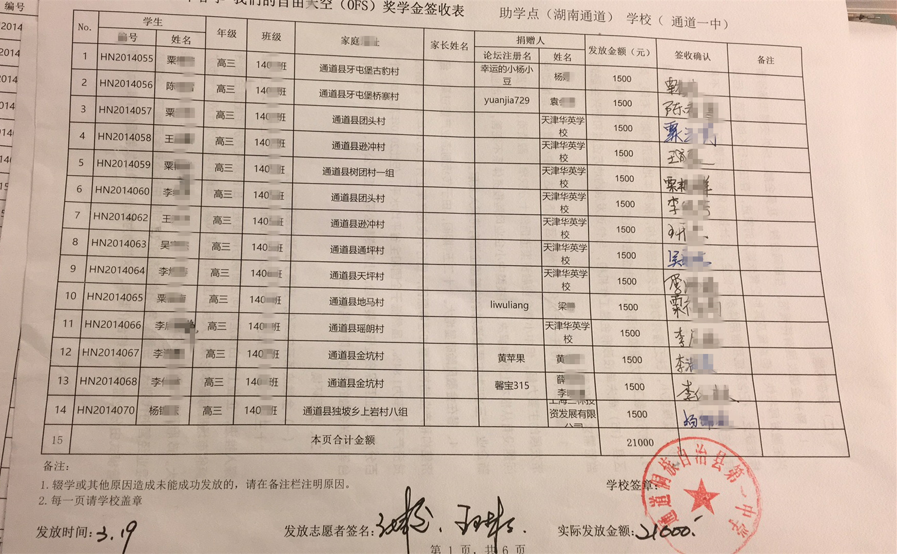 来自全国各地的6位志愿者,在19日到达通道后,于当晚前往通道一中发放了初升高奖学金。本次奖学金发放79名学生,实发78名,一人辍学,实发金额为117.000元。