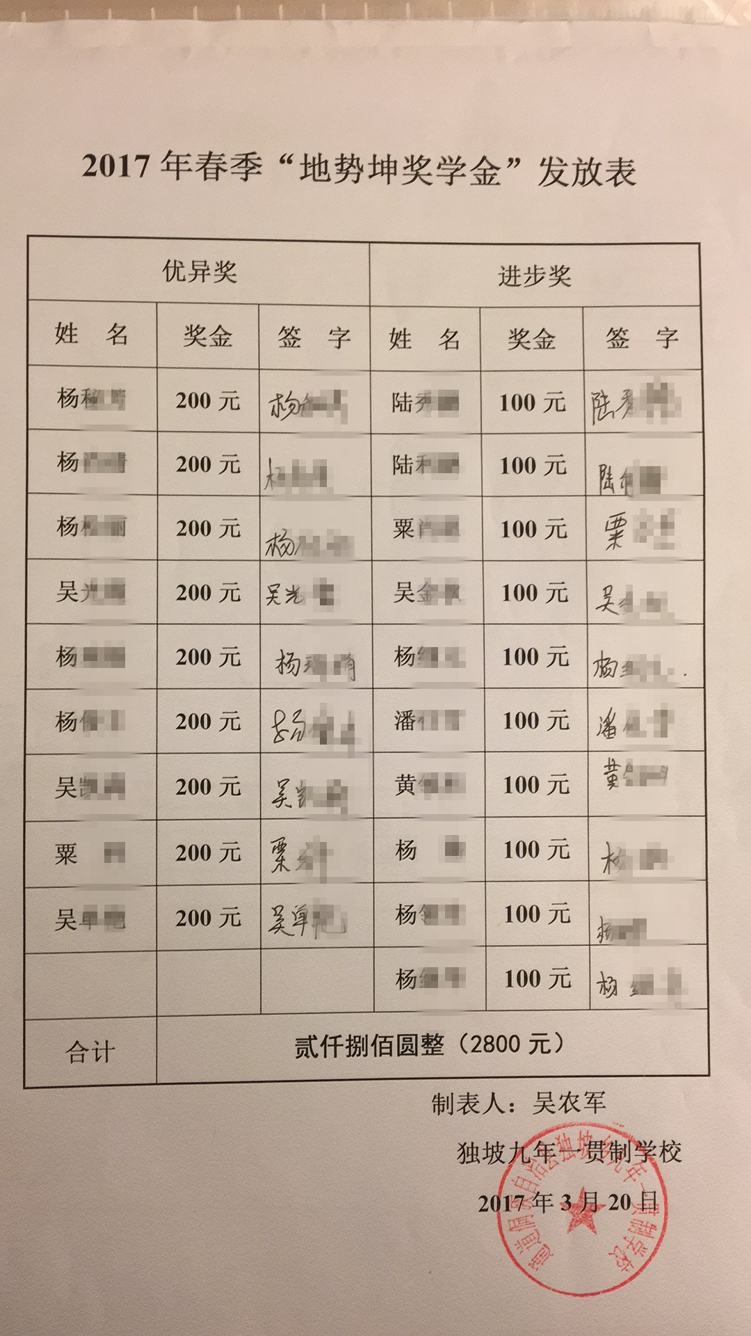 2017年春季湖南通道地势坤奖学金,共有19名学生获得,其中优异奖9名,每人200元;进步奖10名,每人100元,总计2,800元。